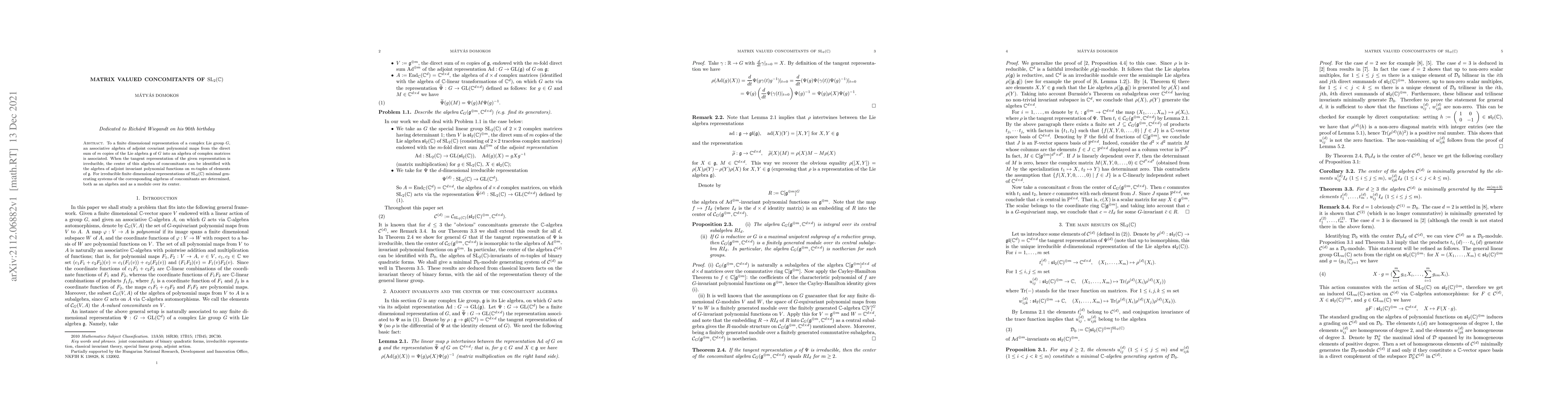 To a finite dimensional representation of a complex Lie group $G$, an associative algebra of adjoint covariant polynomial maps from the direct sum of $m$ copies of the Lie algebra $\mathfrak{g}$ of $G$ into an algebra of complex matrices is associated. When the tangent representation of the given representation is irreducible, the center of this algebra of concomitants can be identified with the algebra of adjoint invariant polynomial functions on $m$-tuples of elements of $\mathfrak{g}$. For irreducible finite dimensional representations of $\mathrm{SL}_2(\mathbb{C})$ minimal generating systems of the corresponding algebras of concomitants are determined, both as an algebra and as a module over its center.