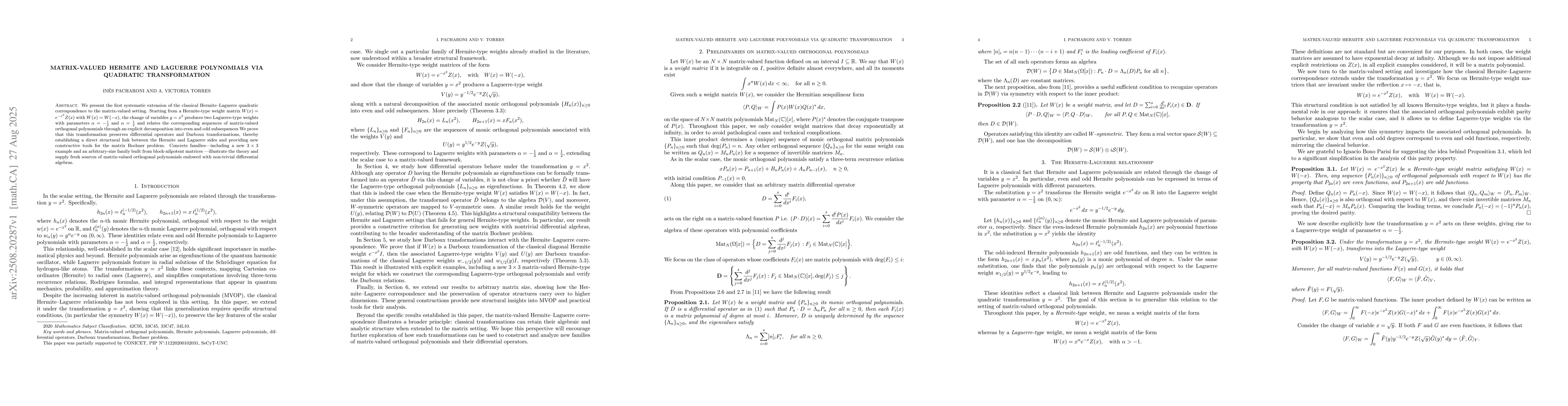We present the first systematic extension of the classical Hermite-Laguerre quadratic correspondence to the matrix-valued setting. Starting from a Hermite-type weight matrix W(x) = exp(-x^2) Z(x) with W(x) = W(-x), the change of variables y = x^2 produces two Laguerre-type weights with parameters alpha = -1/2 and alpha = 1/2, and relates the corresponding sequences of matrix-valued orthogonal polynomials through an explicit decomposition into even and odd subsequences. We prove that this transformation preserves differential operators and Darboux transformations, thereby establishing a direct structural link between the Hermite and Laguerre sides and providing new constructive tools for the matrix Bochner problem. Concrete families - including a new 3x3 example and an arbitrary-size family built from block-nilpotent matrices - illustrate the theory and supply fresh sources of matrix-valued orthogonal polynomials endowed with non-trivial differential algebras.