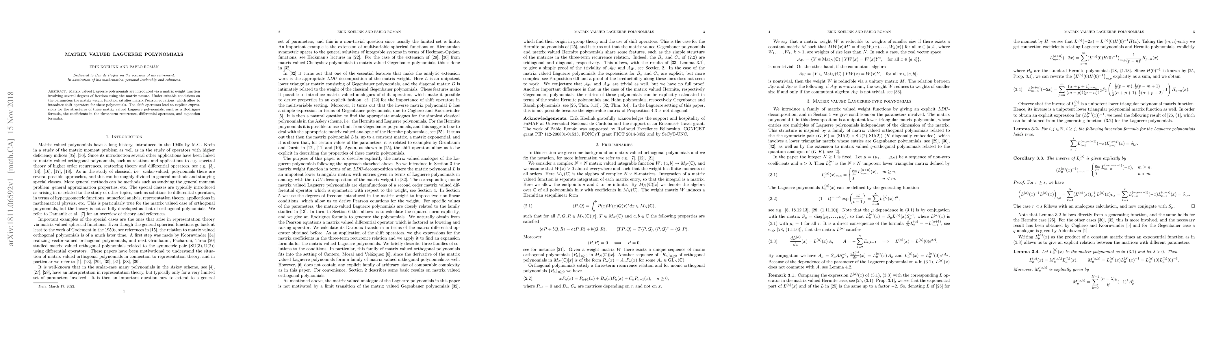 Matrix valued Laguerre polynomials are defined using a matrix-weighted function and satisfy matrix Pearson equations, enabling the introduction of shift operators and derivation of explicit expressions for their structures, including Rodrigues formula and recurrence relations.