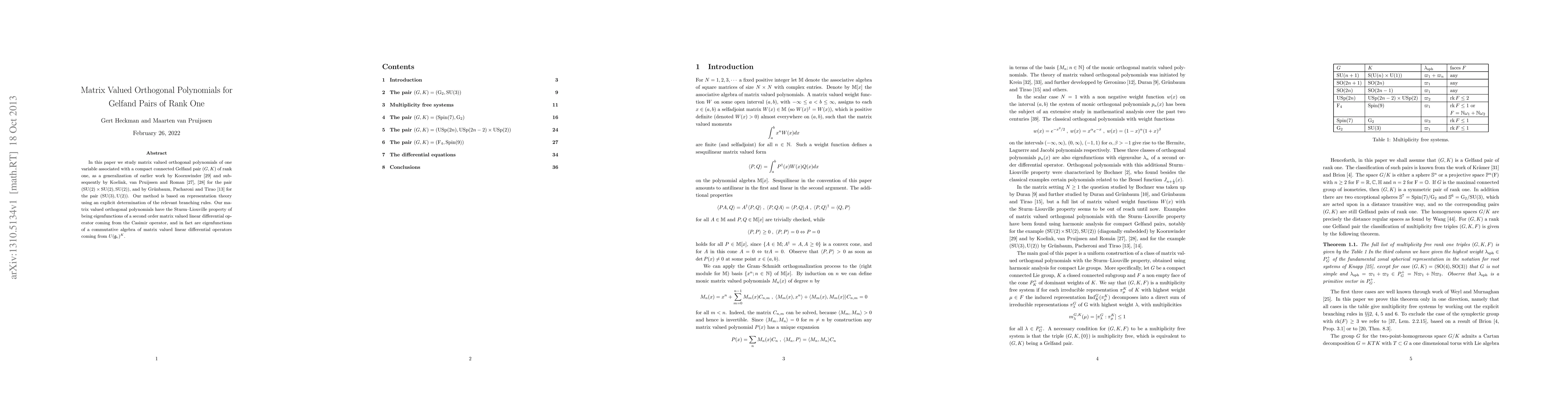 This paper explores matrix valued orthogonal polynomials linked to rank one Gelfand pairs, extending prior work on specific pairs like (SU(2) x SU(2), SU(2)). The study employs representation theory and branching rules to derive these polynomials, which exhibit the Sturm-Liouville property and are eigenfunctions of a matrix-valued differential operator derived from the Casimir operator.