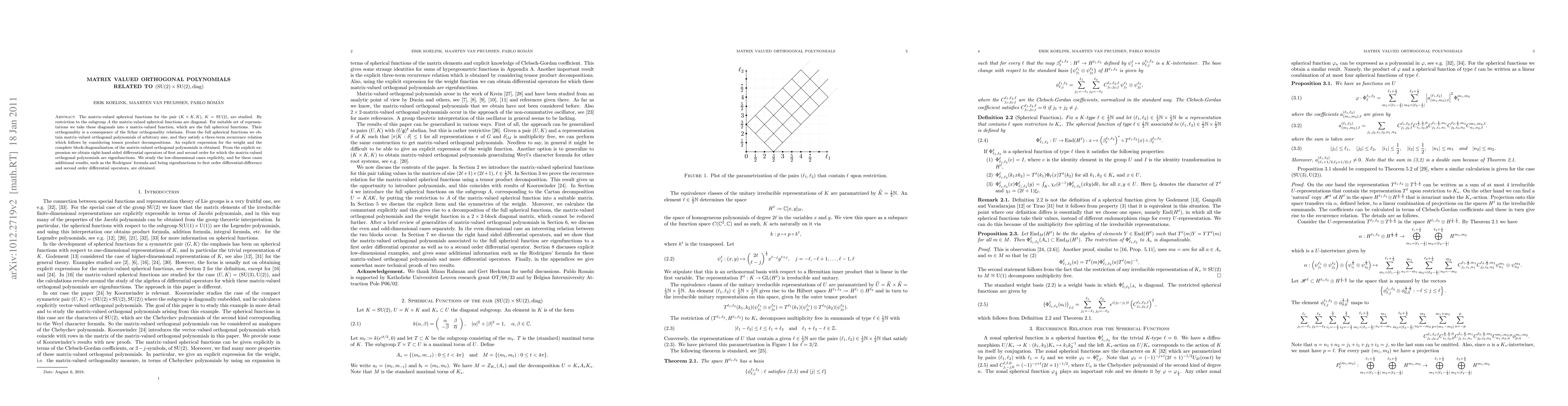 This paper explores matrix-valued spherical functions for the group pair (SU(2) x SU(2), diag), deriving matrix-valued orthogonal polynomials from diagonal spherical functions. These polynomials satisfy a three-term recurrence relation and are eigenfunctions of explicit right-hand sided differential operators.
