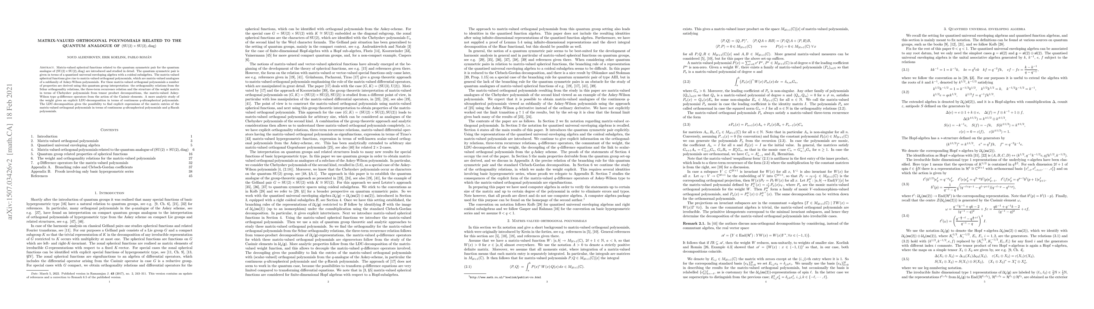 This paper introduces matrix-valued spherical functions and orthogonal polynomials related to the quantum analogue of $(SU(2) \times SU(2), \text{diag})$. These matrix-valued polynomials exhibit properties derived from quantum group interpretations, including recurrence relations and an LDU-decomposition using continuous $q$-ultraspherical polynomials.