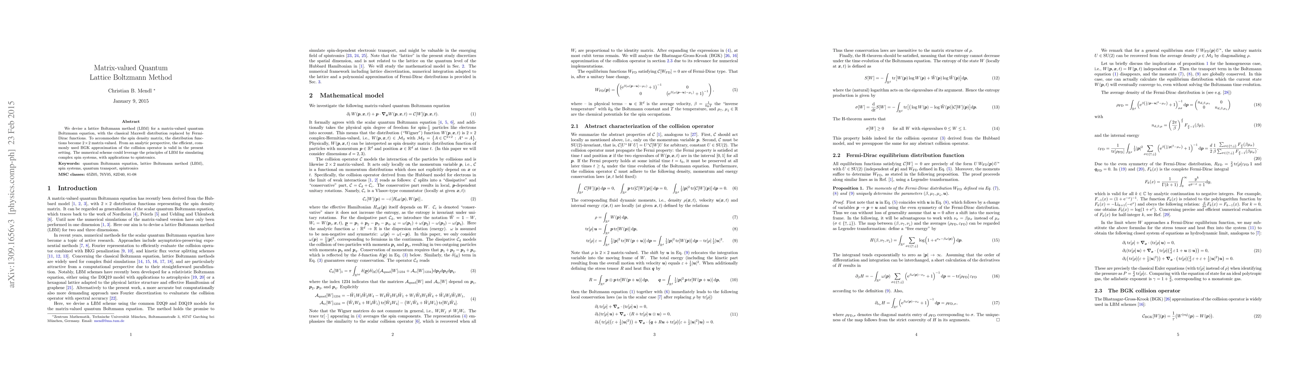 The paper introduces a matrix-valued Quantum Lattice Boltzmann Method (QLBM) for simulating quantum spin systems, replacing the classical Maxwell distribution with Fermi-Dirac functions and using 2 x 2 matrix-valued distribution functions. The BGK approximation remains valid, offering a potential tool for simulating spintronics applications.