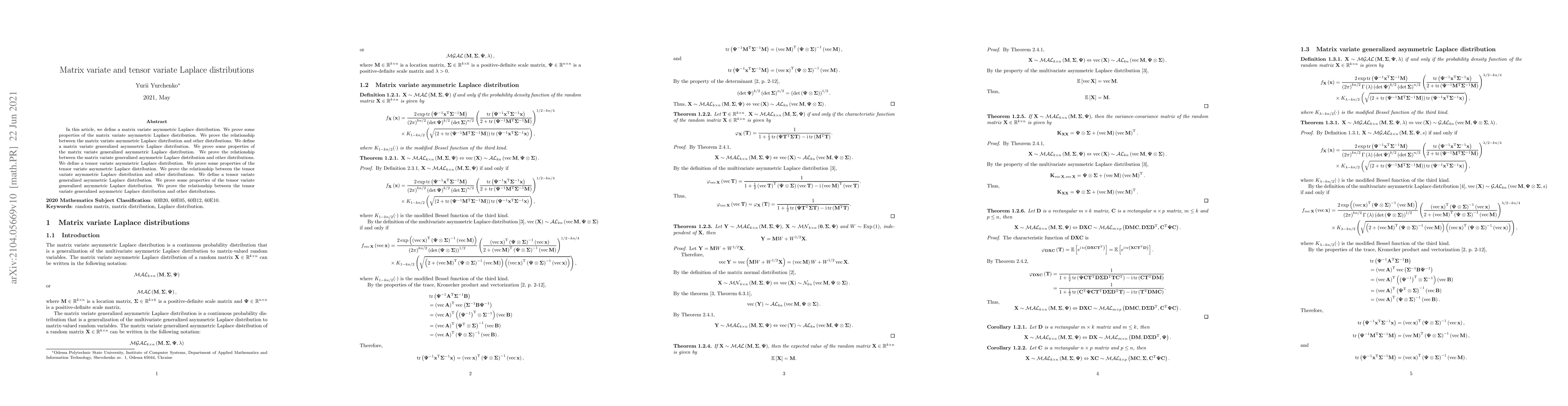 In this article, we define a matrix variate asymmetric Laplace distribution. We prove some properties of the matrix variate asymmetric Laplace distribution. We prove the relationship between the matrix variate asymmetric Laplace distribution and other distributions. We define a matrix variate generalized asymmetric Laplace distribution. We prove some properties of the matrix variate generalized asymmetric Laplace distribution. We prove the relationship between the matrix variate generalized asymmetric Laplace distribution and other distributions. We define a tensor variate asymmetric Laplace distribution. We prove some properties of the tensor variate asymmetric Laplace distribution. We prove the relationship between the tensor variate asymmetric Laplace distribution and other distributions. We define a tensor variate generalized asymmetric Laplace distribution. We prove some properties of the tensor variate generalized asymmetric Laplace distribution. We prove the relationship between the tensor variate generalized asymmetric Laplace distribution and other distributions.