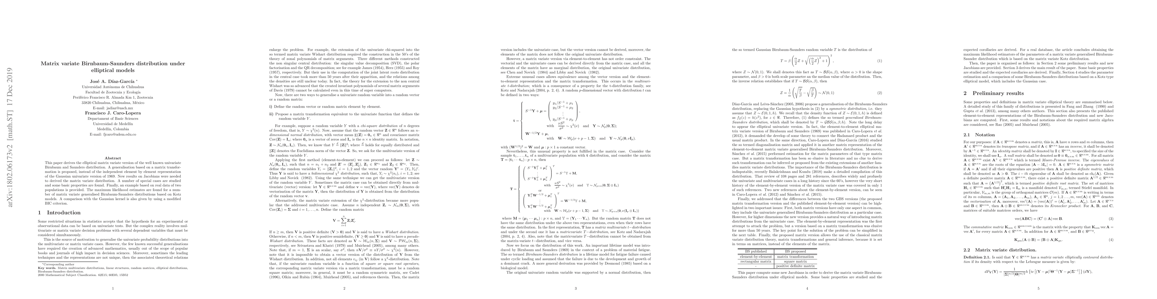 This paper introduces the elliptical matrix variate version of the Birnbaum-Saunders distribution, proposing a matrix transformation generalization. It explores new Jacobian results, special cases, and properties, and compares the maximum likelihood estimates with a Gaussian kernel using real data.