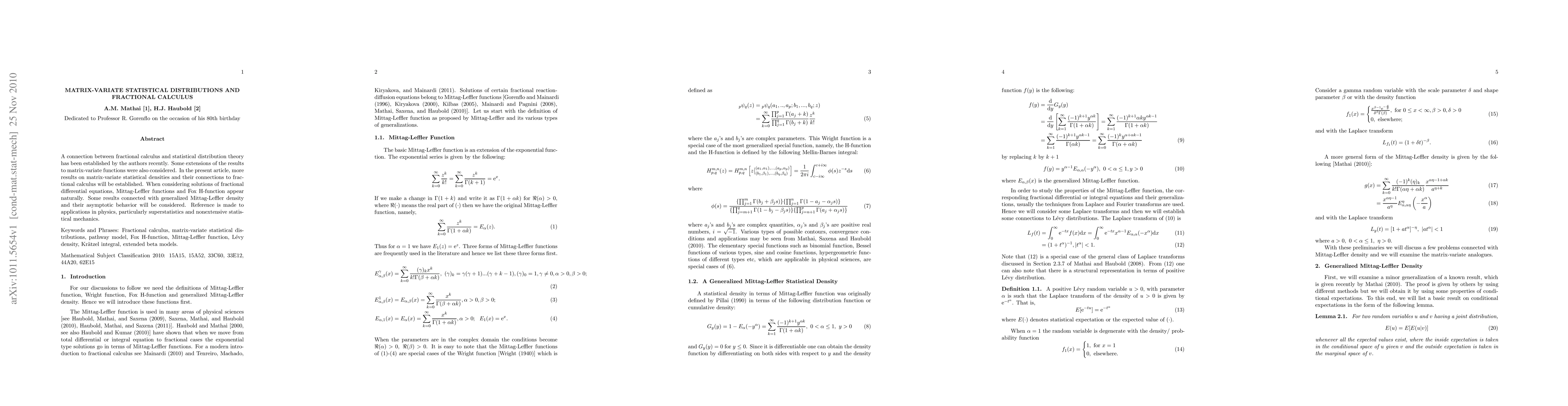 A connection between fractional calculus and statistical distribution theory has been established by the authors recently. Some extensions of the results to matrix-variate functions were also considered. In the present article, more results on matrix-variate statistical densities and their connections to fractional calculus will be established. When considering solutions of fractional differential equations, Mittag-Leffler functions and Fox H-function appear naturally. Some results connected with generalized Mittag-Leffler density and their asymptotic behavior will be considered. Reference is made to applications in physics, particularly superstatistics and nonextensive statistical mechanics.