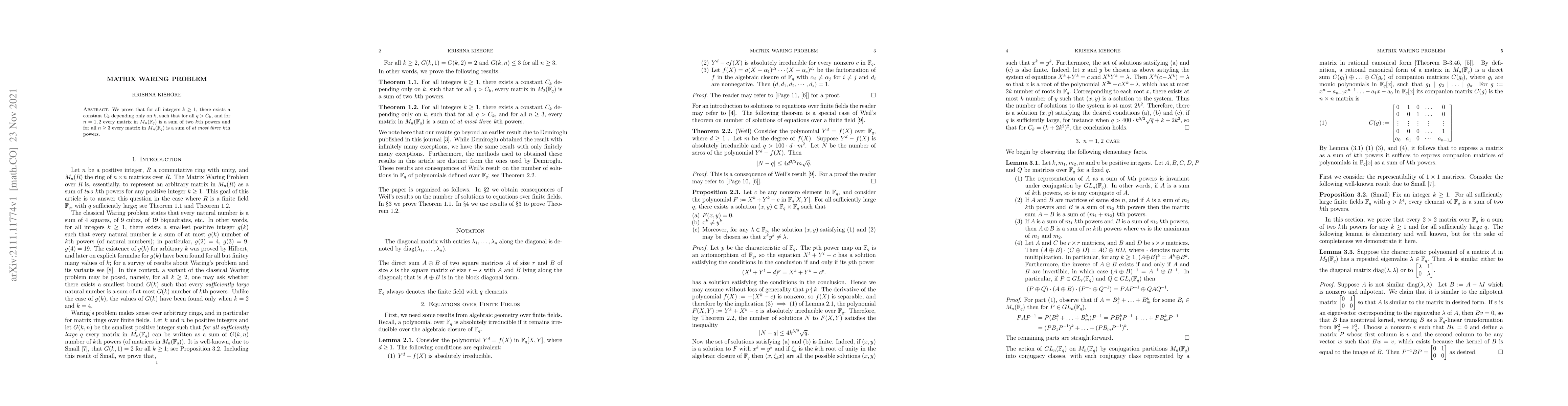 We prove that for all integers $k \geq 1$, there exists a constant $C_k$ depending only on $k$, such that for all $q > C_k$, and for $n = 1, 2$ every matrix in $M_n(\mathbb{F}_q)$ is a sum of two $k$th powers and for all $n \geq 3$ every matrix in $M_n(\mathbb{F}_q)$ is a sum of at most three $k$th powers.