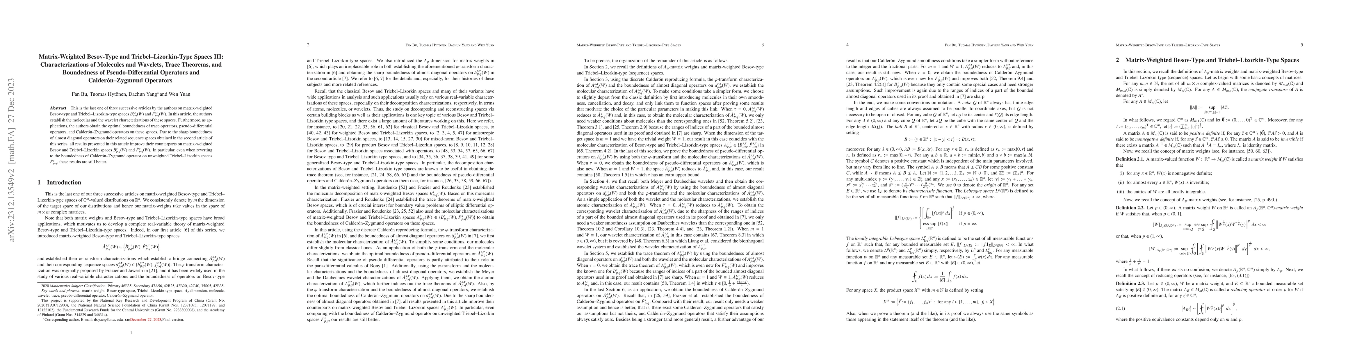 This paper concludes a trilogy on matrix-weighted Besov-type and Triebel-Lizorkin-type spaces, establishing molecular and wavelet characterizations. It also improves boundedness results for trace operators, pseudo-differential operators, and Calderón-Zygmund operators on these spaces.