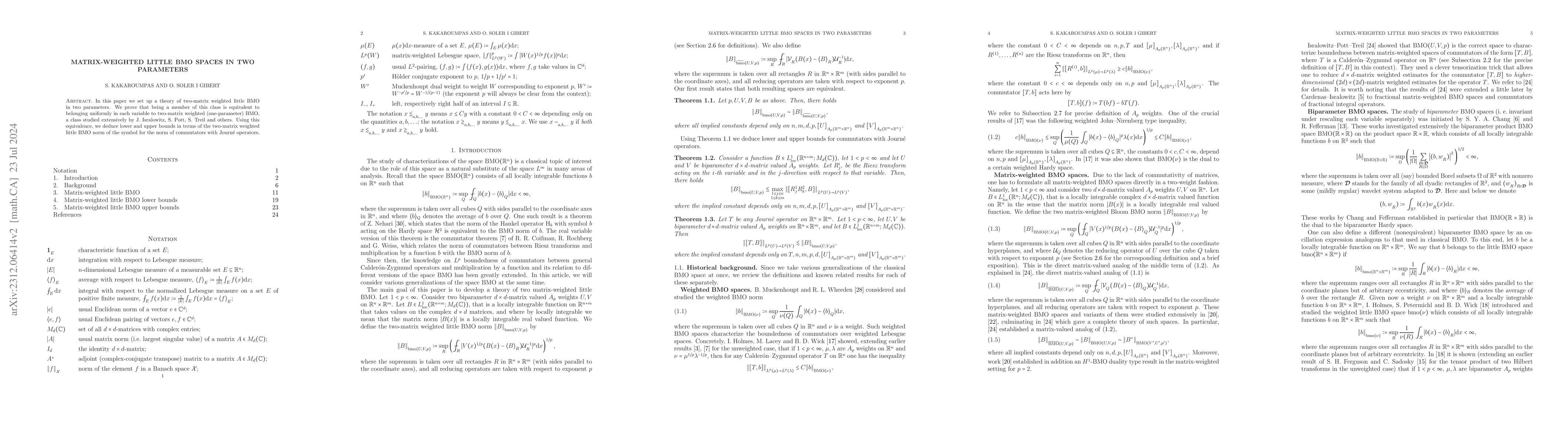 In this paper we set up a theory of two-matrix weighted little $\mathrm{BMO}$ in two parameters. We prove that being a member of this class is equivalent to belonging uniformly in each variable to two-matrix weighted (one-parameter) $\mathrm{BMO}$, a class studied extensively by J. Isralowitz, S. Pott, S. Treil and others. Using this equivalence, we deduce lower and upper bounds in terms of the two-matrix weighted little $\mathrm{BMO}$ norm of the symbol for the norm of commutators with Journ\'e operators. Moreover, we set up the foundations of a theory of two-matrix weighted product $\mathrm{BMO}$ in two parameters. Our main result here is an appropriate version of $H^1$-$\mathrm{BMO}$ duality in this setting for any Lebesgue exponent $1