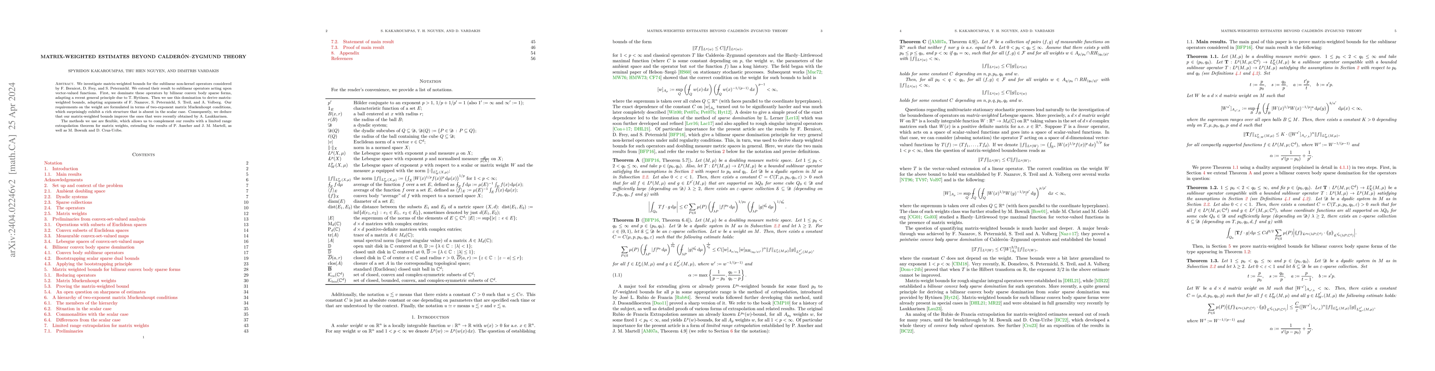 We investigate matrix-weighted bounds for the sublinear non-kernel operators considered by F. Bernicot, D. Frey, and S. Petermichl. We extend their result to sublinear operators acting upon vector-valued functions. First, we dominate these operators by bilinear convex body sparse forms, adapting a recent general principle due to T. Hyt\"onen. Then we use this domination to derive matrix-weighted bounds, adapting arguments of F. Nazarov, S. Petermichl, S. Treil, and A. Volberg. Our requirements on the weight are formulated in terms of two-exponent matrix Muckenhoupt conditions, which surprisingly exhibit a rich structure that is absent in the scalar case. Consequently, we deduce that our matrix-weighted bounds improve the ones that were recently obtained by A. Laukkarinen. The methods we use are flexible, which allows us to complement our results with a limited range extrapolation theorem for matrix weights, extending the results of P. Auscher and J. M. Martell, as well as M. Bownik and D. Cruz-Uribe.