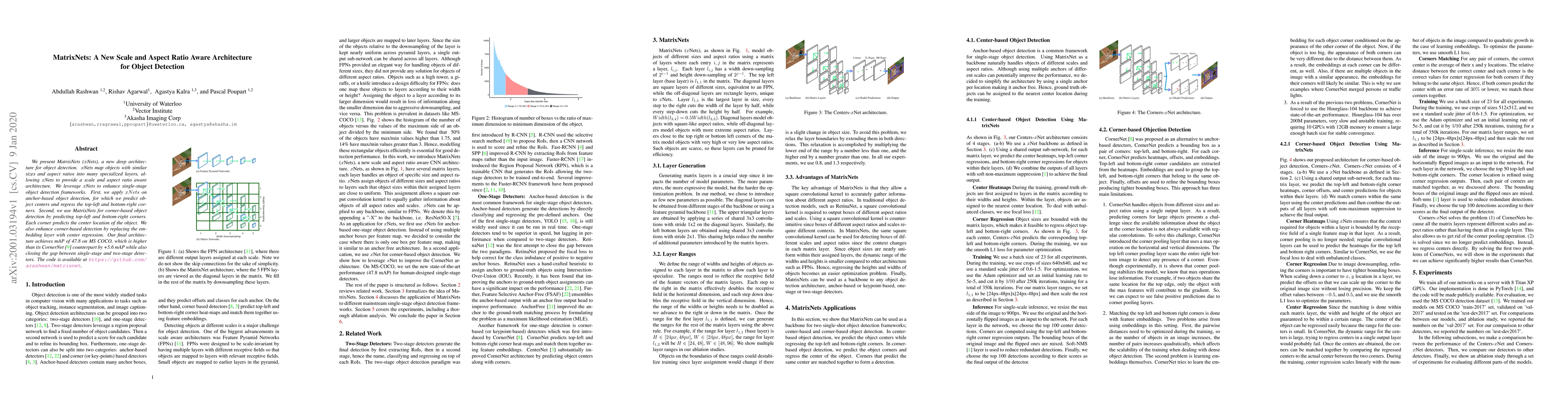 MatrixNets (xNets) introduce a new deep architecture for object detection that maps objects with similar sizes and aspect ratios into specialized layers, enhancing single-stage detection frameworks. The architecture achieves an mAP of 47.8 on MS COCO, outperforming its CornerNet counterpart by +5.6 mAP.