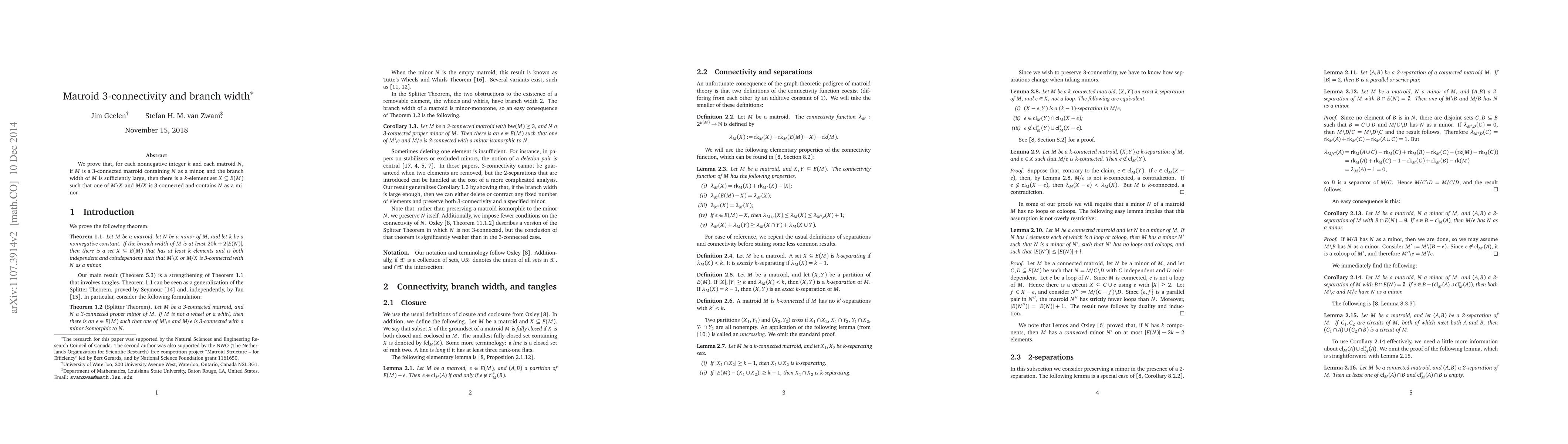 We prove that, for each nonnegative integer k and each matroid N, if M is a 3-connected matroid containing N as a minor, and the the branch width of M is sufficiently large, then there is a k-element subset X of E(M) such that one of M\X and M/X is 3-connected and contains N as a minor.