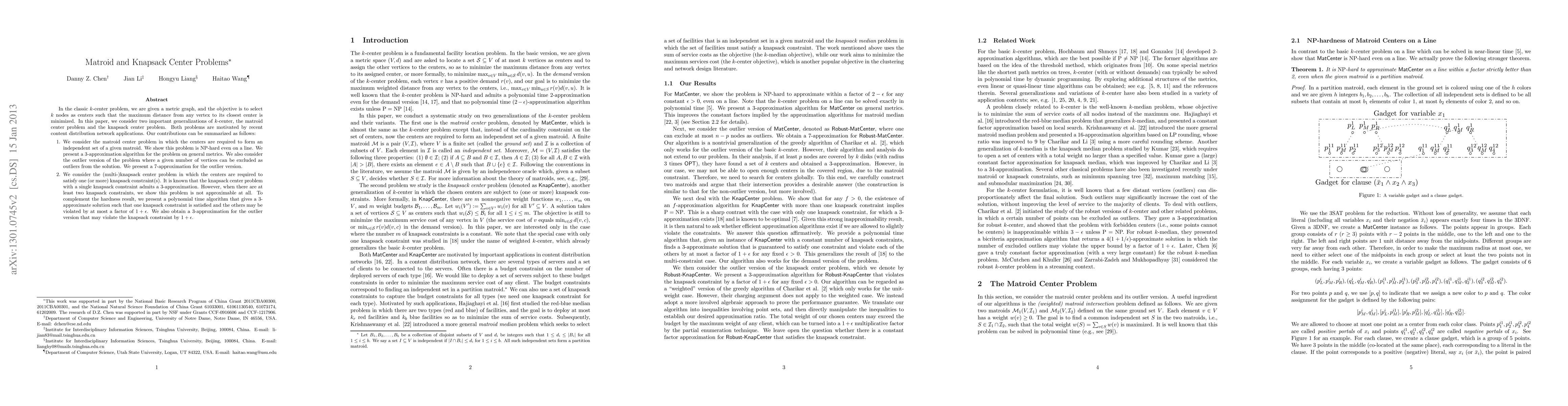 This paper explores two generalizations of the $k$-center problem: the matroid center problem and the knapsack center problem. It presents a 3-approximation algorithm for the matroid center problem and a 7-approximation for its outlier version. For the knapsack center problem, it proves inapproximability with multiple knapsack constraints but offers a 3-approximation algorithm that satisfies one constraint while allowing others to be violated by $1+\epsilon$.