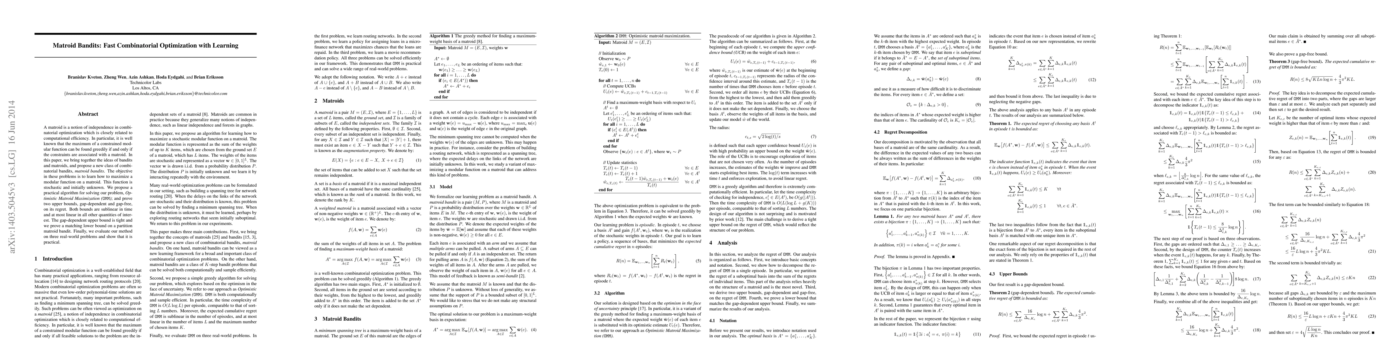 This paper introduces matroid bandits, a new class of combinatorial optimization problems where the goal is to maximize a stochastic, initially unknown function on a matroid. The authors propose the Optimistic Matroid Maximization (OMM) algorithm and prove sublinear regret bounds, demonstrating its practical effectiveness through evaluations on three real-world problems.