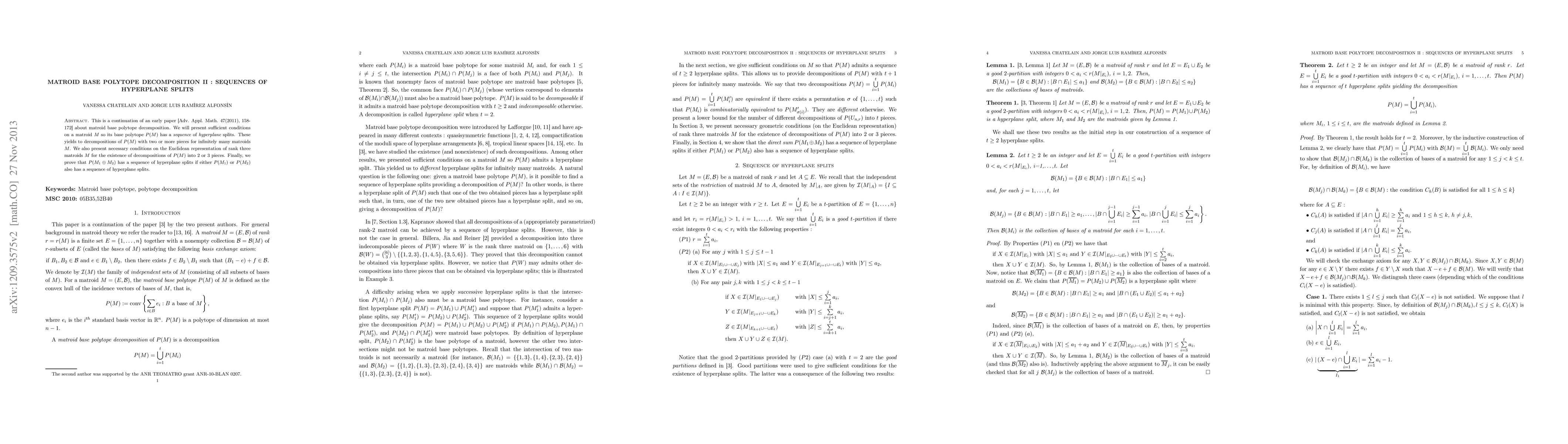 This is a continuation of the early paper concerning matroid base polytope decomposition. Here, we will present sufficient conditions on $M$ so its base matroid polytope $P(M)$ has a {\em sequence} of hyperplane splits. The latter yields to decompositions of $P(M)$ with two or more pieces for infinitely many matroids $M$. We also present necessary conditions on the Euclidean representation of rank three matroids $M$ for the existences of decompositions of $P(M)$ into $2$ or $3$ pieces. Finally, we prove that $P(M_1 \oplus M_2)$ has a sequence of hyperplane splits if either $P(M_1)$ or $P(M_2)$ also has a sequence of hyperplane splits.