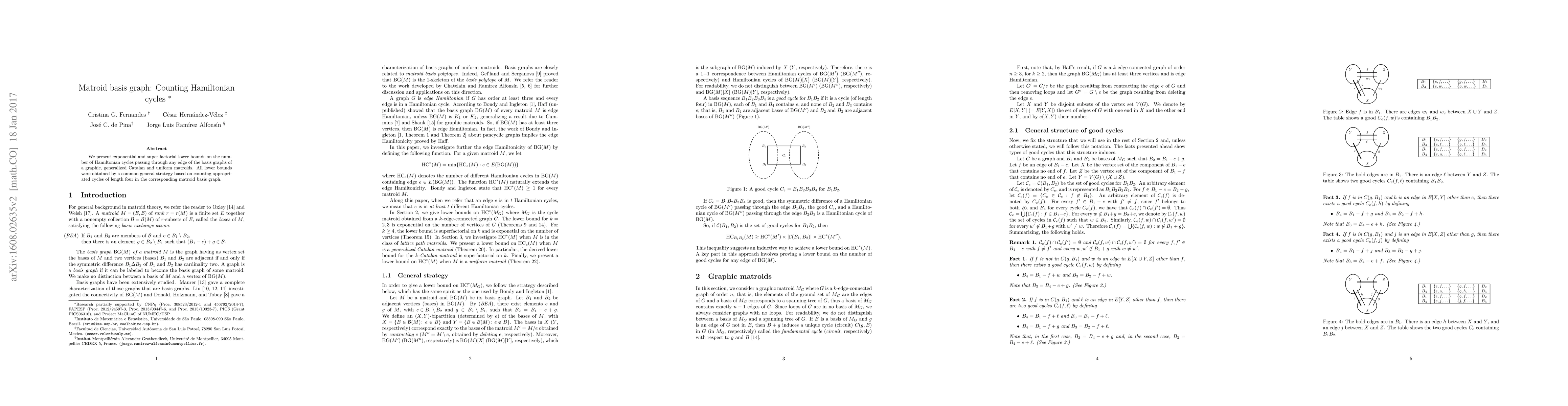 This paper establishes exponential and super factorial lower bounds for Hamiltonian cycles in the basis graphs of graphic, generalized Catalan, and uniform matroids, utilizing a unified counting strategy based on four-length cycles. These results provide significant insights into the structure of matroid basis graphs.
