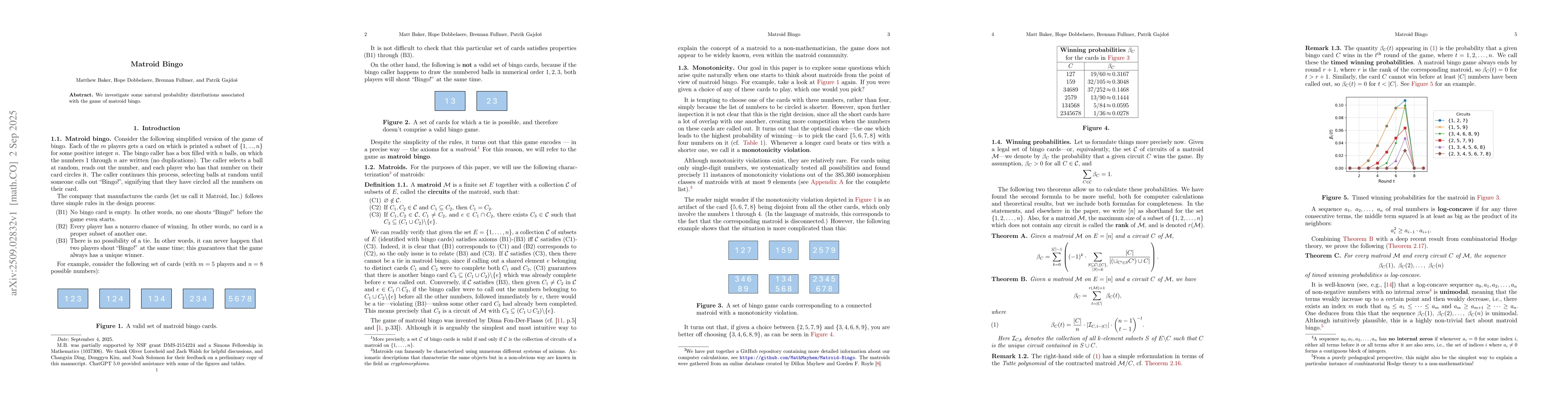 We investigate some natural probability distributions associated with the game of matroid bingo.