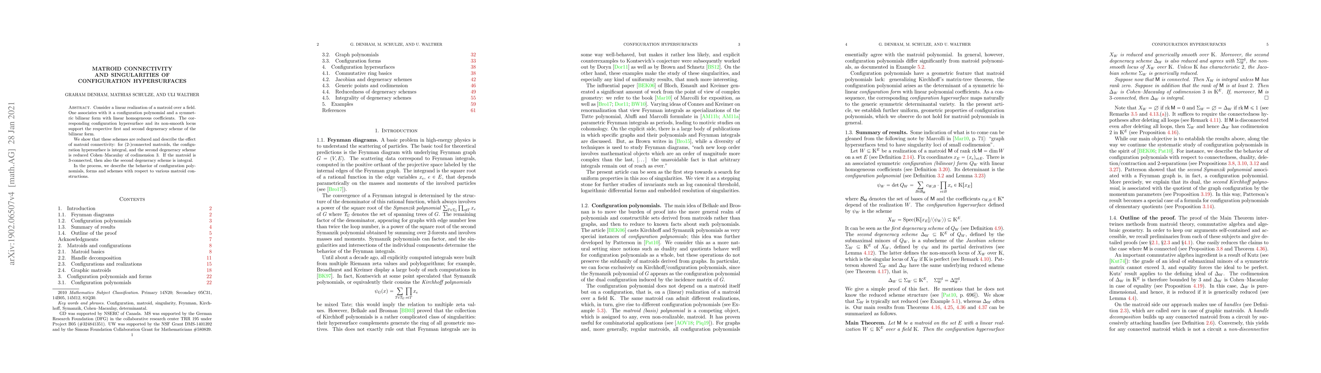Consider a linear realization of a matroid over a field. One associates with it a configuration polynomial and a symmetric bilinear form with linear homogeneous coefficients. The corresponding configuration hypersurface and its non-smooth locus support the respective first and second degeneracy scheme of the bilinear form. We show that these schemes are reduced and describe the effect of matroid connectivity: for (2-)connected matroids, the configuration hypersurface is integral, and the second degeneracy scheme is reduced Cohen-Macaulay of codimension 3. If the matroid is 3-connected, then also the second degeneracy scheme is integral. In the process, we describe the behavior of configuration polynomials, forms and schemes with respect to various matroid constructions.