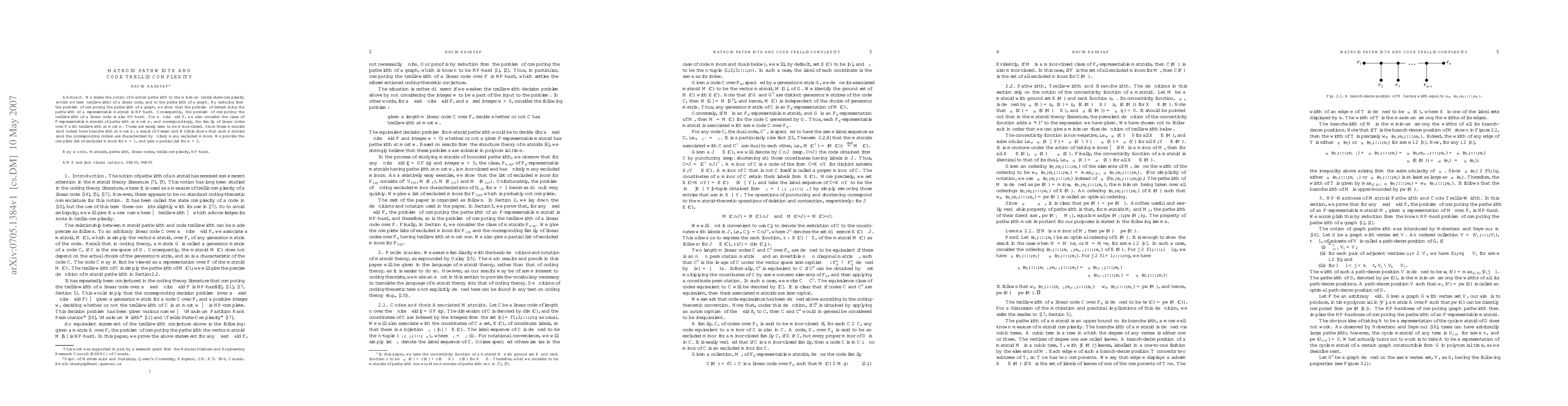 This paper establishes the NP-hardness of determining the pathwidth of representable matroids and the trellis-width of linear codes, linking these concepts to graph pathwidth. It also characterizes minor-closed classes of matroids and corresponding linear codes with bounded pathwidth using excluded minors, providing a complete list for pathwidth 1 and a partial list for pathwidth 2.