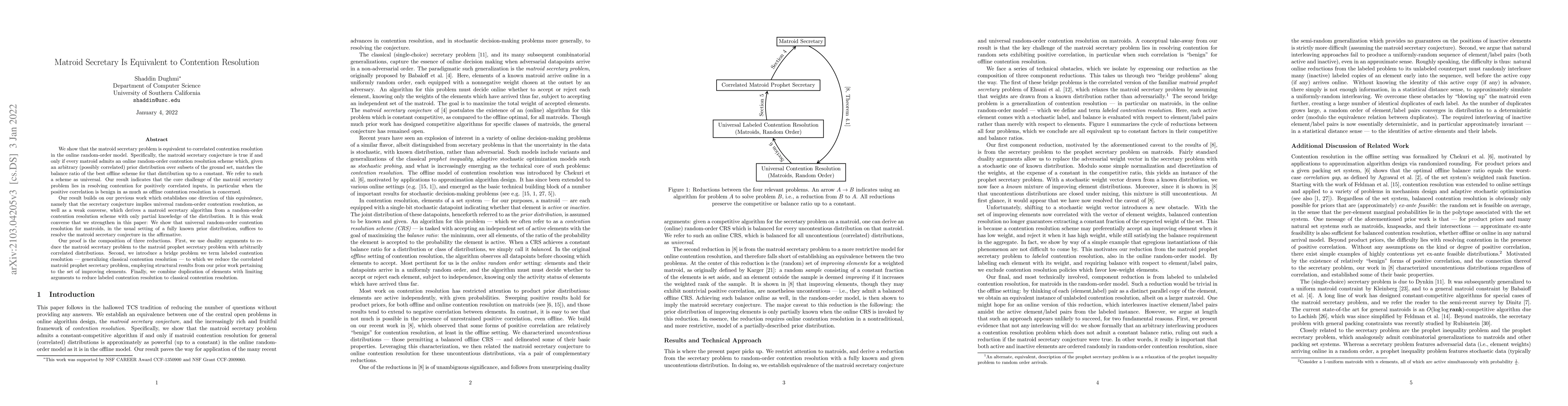 We show that the matroid secretary problem is equivalent to correlated contention resolution in the online random-order model. Specifically, the matroid secretary conjecture is true if and only if every matroid admits an online random-order contention resolution scheme which, given an arbitrary (possibly correlated) prior distribution over subsets of the ground set, matches the balance ratio of the best offline scheme for that distribution up to a constant. We refer to such a scheme as universal. Our result indicates that the core challenge of the matroid secretary problem lies in resolving contention for positively correlated inputs, in particular when the positive correlation is benign in as much as offline contention resolution is concerned. Our result builds on our previous work which establishes one direction of this equivalence, namely that the secretary conjecture implies universal random-order contention resolution, as well as a weak converse, which derives a matroid secretary algorithm from a random-order contention resolution scheme with only partial knowledge of the distribution. It is this weak converse that we strengthen in this paper: We show that universal random-order contention resolution for matroids, in the usual setting of a fully known prior distribution, suffices to resolve the matroid secretary conjecture in the affirmative. Our proof is the composition of three reductions. First, we use duality arguments to reduce the matroid secretary problem to the matroid prophet secretary problem with arbitrarily correlated distributions. Second, we introduce a generalization of contention resolution we term labeled contention resolution, to which we reduce the correlated matroid prophet secretary problem. Finally, we combine duplication of elements with limiting arguments to reduce labeled contention resolution to classical contention resolution.