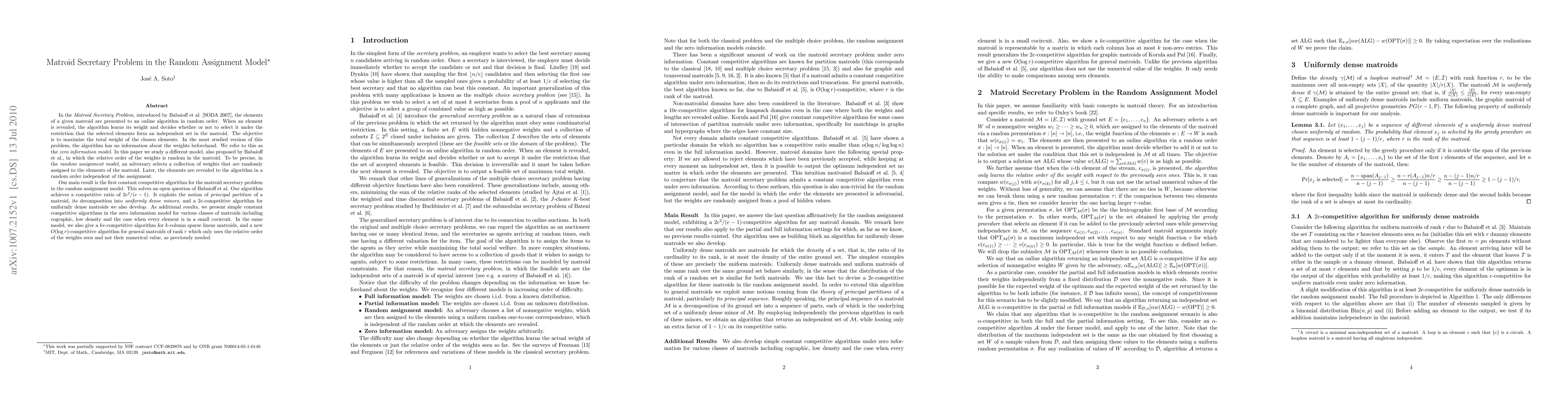 In the Matroid Secretary Problem, introduced by Babaioff et al. [SODA 2007], the elements of a given matroid are presented to an online algorithm in random order. When an element is revealed, the algorithm learns its weight and decides whether or not to select it under the restriction that the selected elements form an independent set in the matroid. The objective is to maximize the total weight of the chosen elements. In the most studied version of this problem, the algorithm has no information about the weights beforehand. We refer to this as the zero information model. In this paper we study a different model, also proposed by Babaioff et al., in which the relative order of the weights is random in the matroid. To be precise, in the random assignment model, an adversary selects a collection of weights that are randomly assigned to the elements of the matroid. Later, the elements are revealed to the algorithm in a random order independent of the assignment. Our main result is the first constant competitive algorithm for the matroid secretary problem in the random assignment model. This solves an open question of Babaioff et al. Our algorithm achieves a competitive ratio of $2e^2/(e-1)$. It exploits the notion of principal partition of a matroid, its decomposition into uniformly dense minors, and a $2e$-competitive algorithm for uniformly dense matroids we also develop. As additional results, we present simple constant competitive algorithms in the zero information model for various classes of matroids including cographic, low density and the case when every element is in a small cocircuit. In the same model, we also give a $ke$-competitive algorithm for $k$-column sparse linear matroids, and a new $O(\log r)$-competitive algorithm for general matroids of rank $r$ which only uses the relative order of the weights seen and not their numerical value, as previously needed.