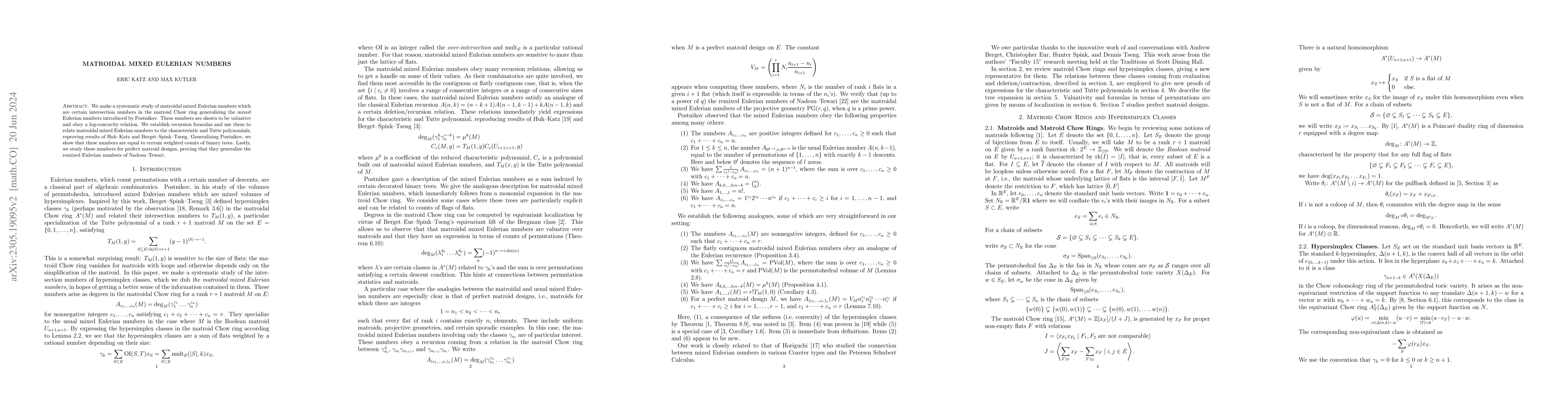 This paper systematically explores matroidal mixed Eulerian numbers, proving their valency, log-concavity, and establishing recursion formulas. It connects these numbers to characteristic and Tutte polynomials, and generalizes their equivalence to weighted counts of binary trees, extending the work of Postnikov and Nadeau-Tewari for perfect matroid designs.