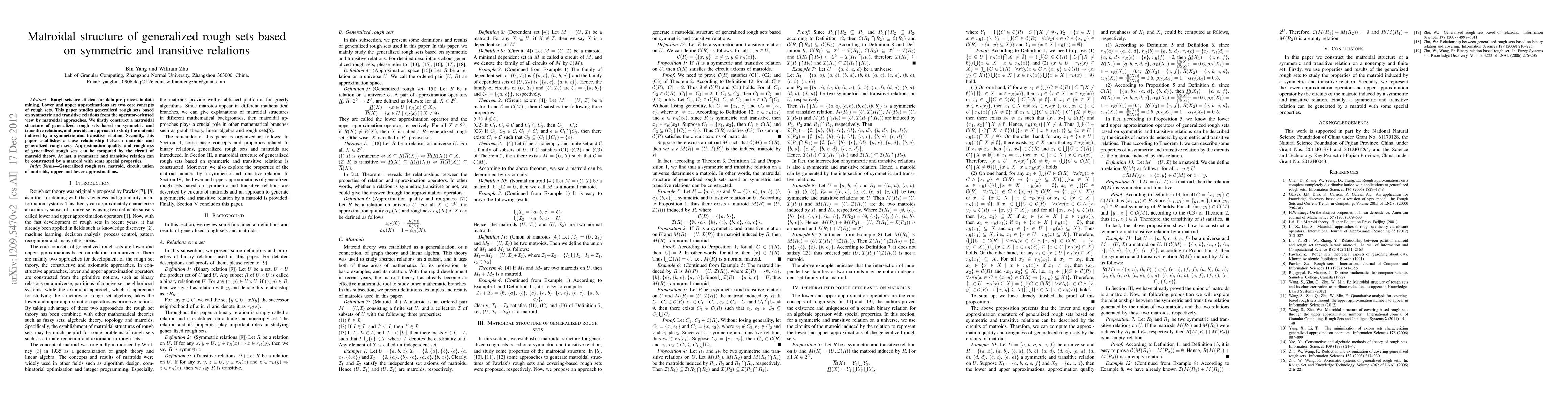 This paper constructs a matroidal structure for generalized rough sets based on symmetric and transitive relations, establishing a link between matroid theory and rough set theory to compute approximation quality and roughness. It also shows how a symmetric and transitive relation can be derived from a matroid with specific properties.