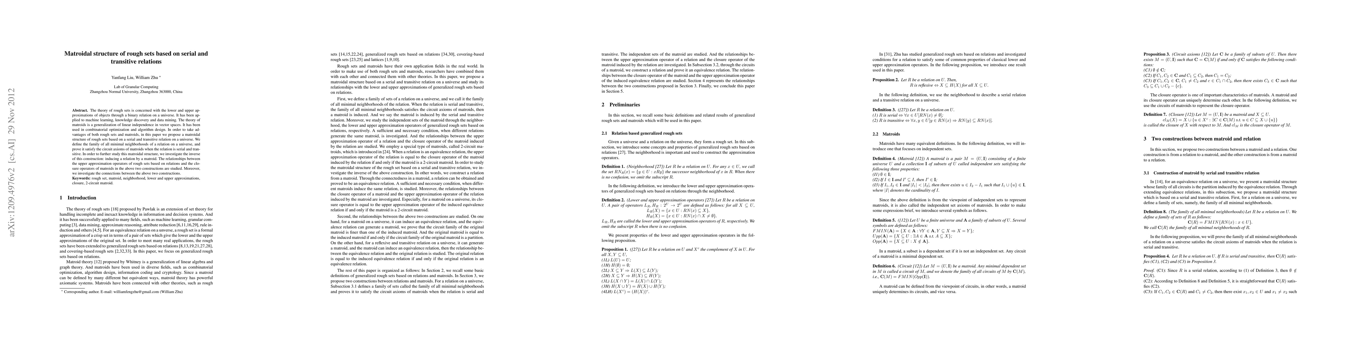 This paper proposes a matroidal structure for rough sets based on serial and transitive relations, defining minimal neighborhoods that satisfy matroid circuit axioms. It also explores the inverse construction of inducing a relation from a matroid, and examines the relationships between rough set approximations and matroid closure operators.