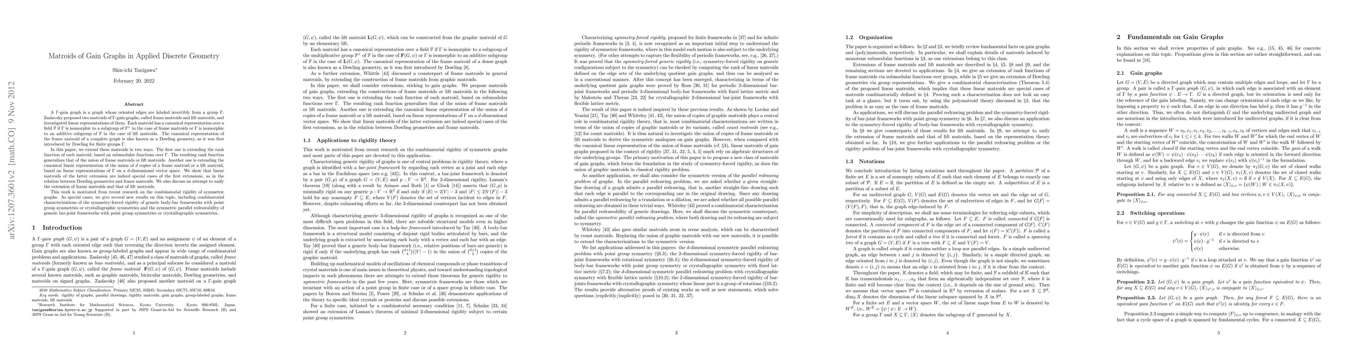 This paper extends the matroids of G-gain graphs, specifically frame and lift matroids, by generalizing their rank functions and canonical linear representations. It also explores the combinatorial rigidity of symmetric graphs, providing new results on symmetry-forced rigidity and symmetric parallel redrawability.