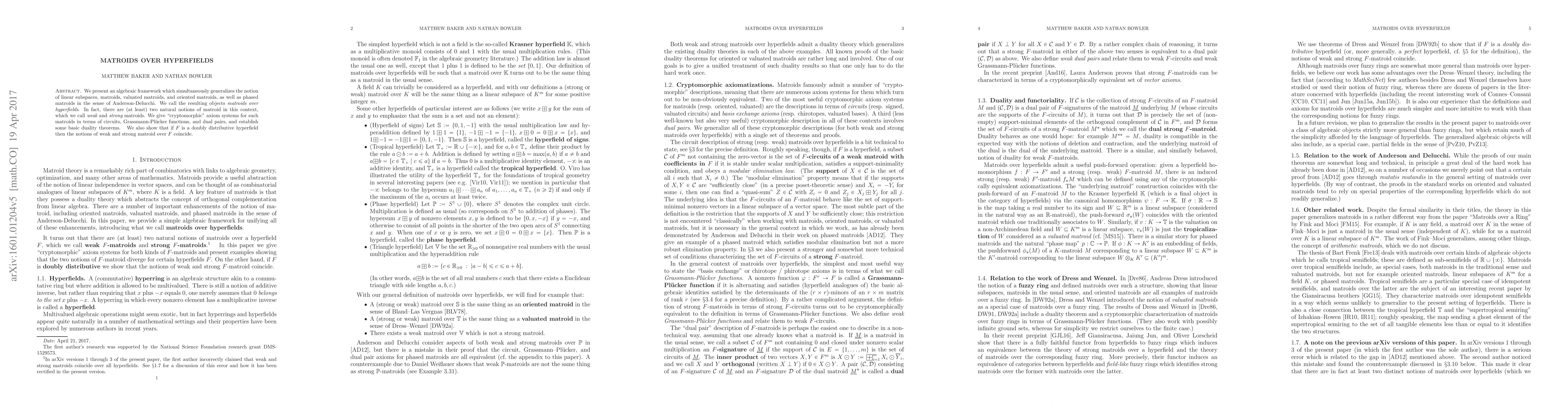 The paper introduces the concept of matroids over hyperfields, providing axiomatic systems and duality theorems for weak and strong matroids, and establishing the equivalence of weak and strong matroids over doubly distributive hyperfields.