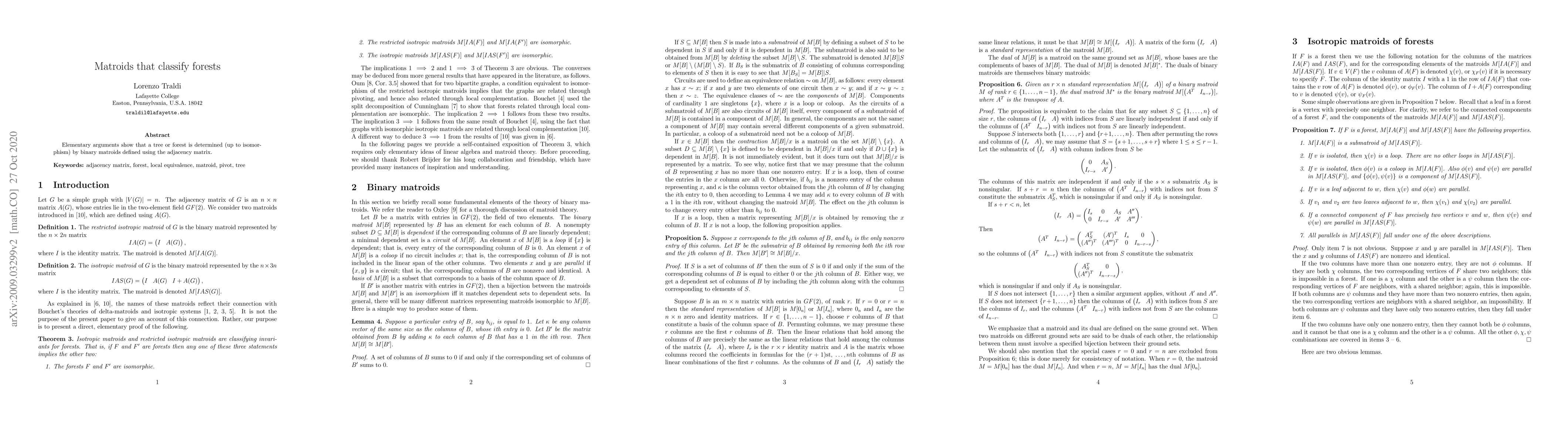 Elementary arguments show that a tree or forest is determined (up to isomorphism) by binary matroids defined using the adjacency matrix.