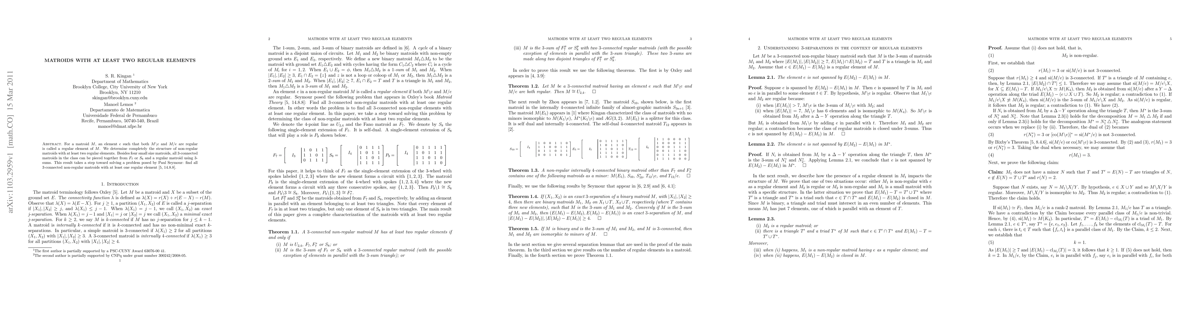 This paper identifies the structure of 3-connected non-regular matroids with at least two regular elements, showing that they can be constructed from $F_7$ or $S_8$ and a regular matroid using 3-sums, contributing to solving a problem posed by Paul Seymour.