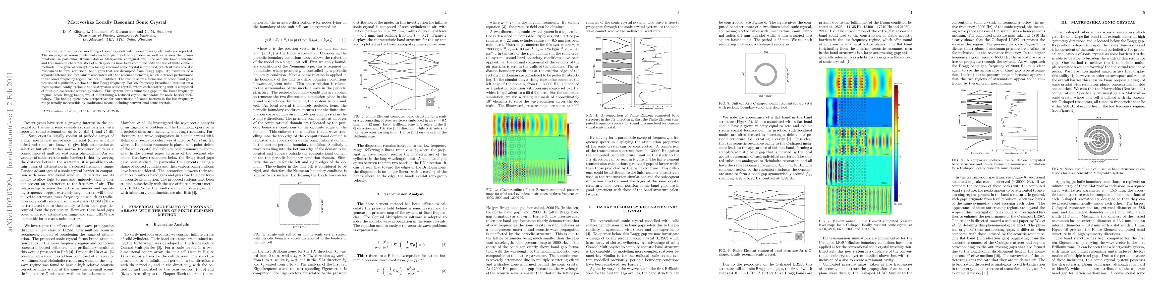 This paper presents numerical modelling of locally resonant sonic crystals, particularly focusing on Matryoshka configurations, which utilize concentric slotted cylinders to create broad, low-frequency band gaps. The study identifies a new attenuation mechanism that enhances performance in the low-frequency regime, offering potential for innovative low-frequency noise barrier technology.