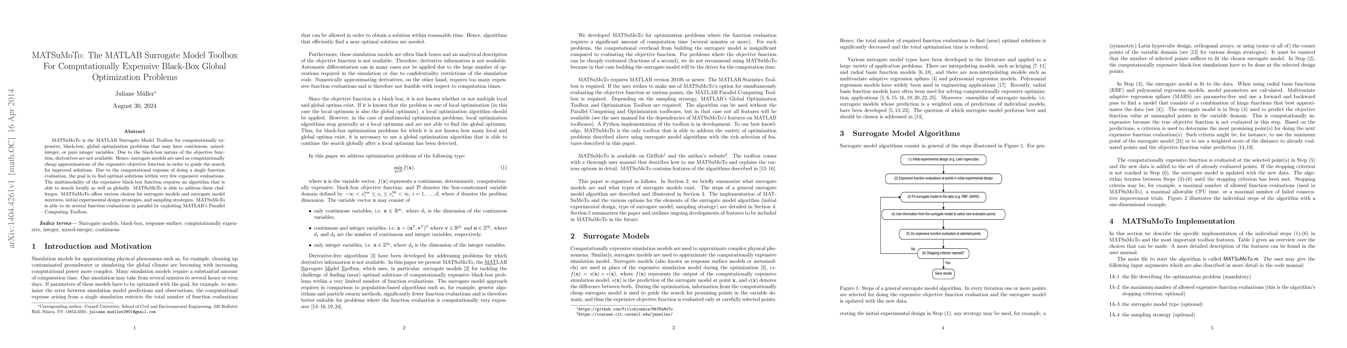 MATSuMoTo is the MATLAB Surrogate Model Toolbox for computationally expensive, black-box, global optimization problems that may have continuous, mixed-integer, or pure integer variables. Due to the black-box nature of the objective function, derivatives are not available. Hence, surrogate models are used as computationally cheap approximations of the expensive objective function in order to guide the search for improved solutions. Due to the computational expense of doing a single function evaluation, the goal is to find optimal solutions within very few expensive evaluations. The multimodality of the expensive black-box function requires an algorithm that is able to search locally as well as globally. MATSuMoTo is able to address these challenges. MATSuMoTo offers various choices for surrogate models and surrogate model mixtures, initial experimental design strategies, and sampling strategies. MATSuMoTo is able to do several function evaluations in parallel by exploiting MATLAB's Parallel Computing Toolbox.