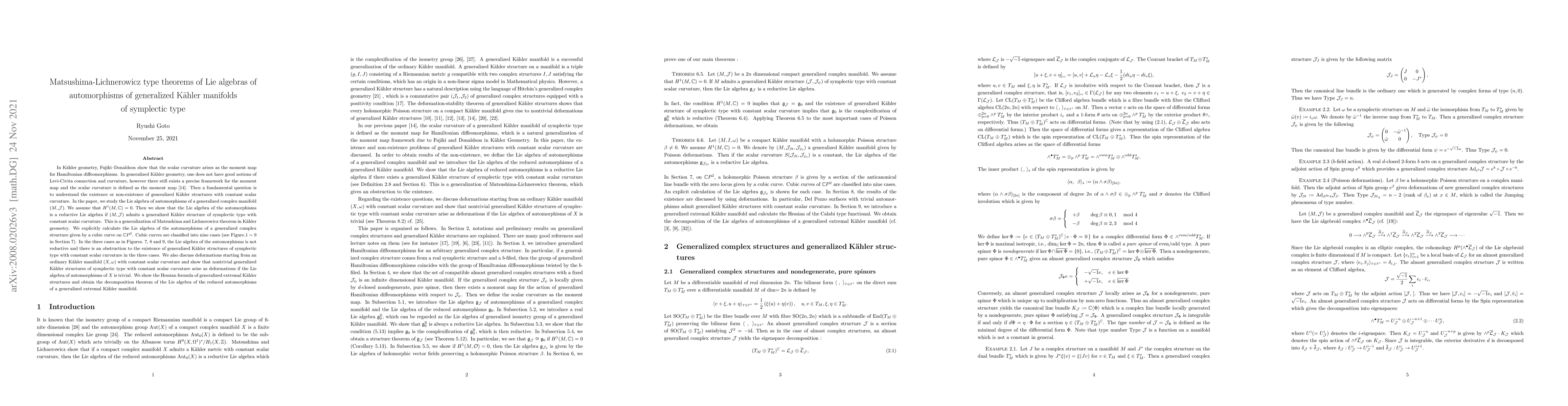 This paper generalizes Matsushima-Lichnerowicz theorems to the context of generalized Kähler manifolds of symplectic type, showing that the Lie algebra of automorphisms is reductive if such manifolds have constant scalar curvature. It also calculates the automorphisms' Lie algebra for cubic curves on $\Bbb C P^2$, revealing obstructions in specific cases, and discusses deformations from Kähler manifolds with constant scalar curvature.