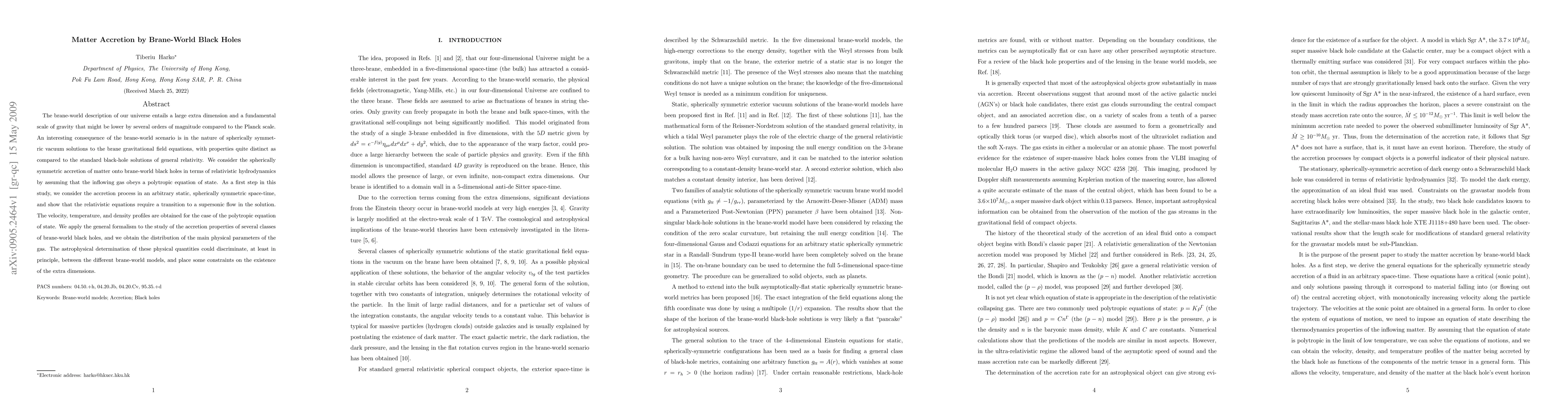 The paper presents a detailed relativistic hydrodynamical analysis of matter accretion onto brane-world black holes, deriving velocity, temperature, and density profiles for various classes of brane-world black hole solutions.
