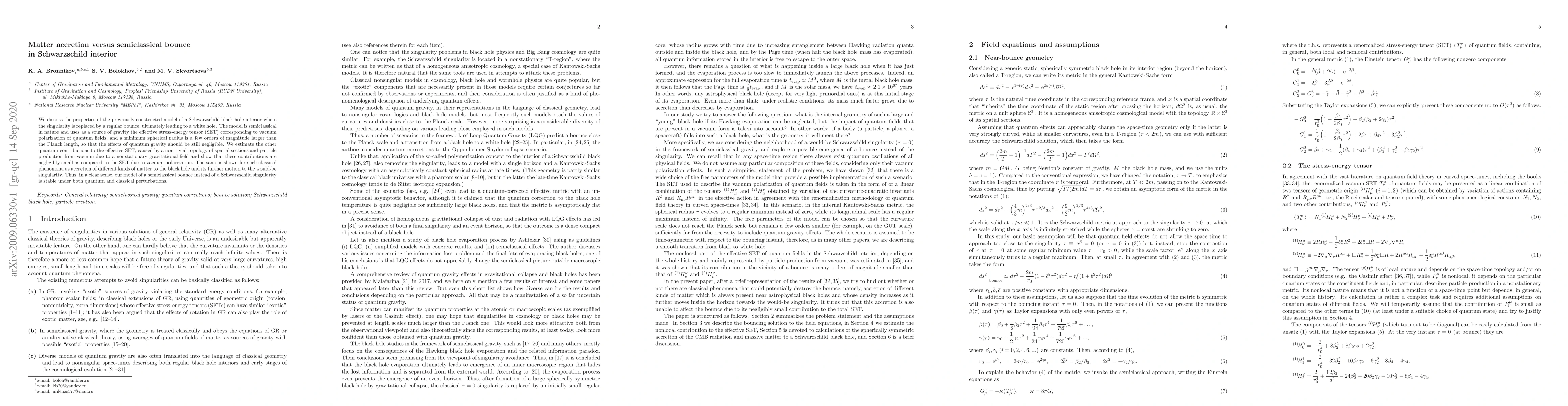 We discuss the properties of the previously constructed model of a Schwarzschild black hole interior where the singularity is replaced by a regular bounce, ultimately leading to a white hole. The model is semiclassical in nature and uses as a source of gravity the effective stress-energy tensor (SET) corresponding to vacuum polarization of quantum fields, and a minimum spherical radius is a few orders of magnitude larger than the Planck length, so that the effects of quantum gravity should be still negligible. We estimate the other quantum contributions to the effective SET, caused by a nontrivial topology of spatial sections and particle production from vacuum due to a nonstationary gravitational field and show that these contributions are negligibly small as compared to the SET due to vacuum polarization. The same is shown for such classical phenomena as accretion of different kinds of matter to the black hole and its further motion to the would-be singularity. Thus, in a clear sense, our model of a semiclassical bounce instead of a Schwarzschild singularity is stable under both quantum and classical perturbations.