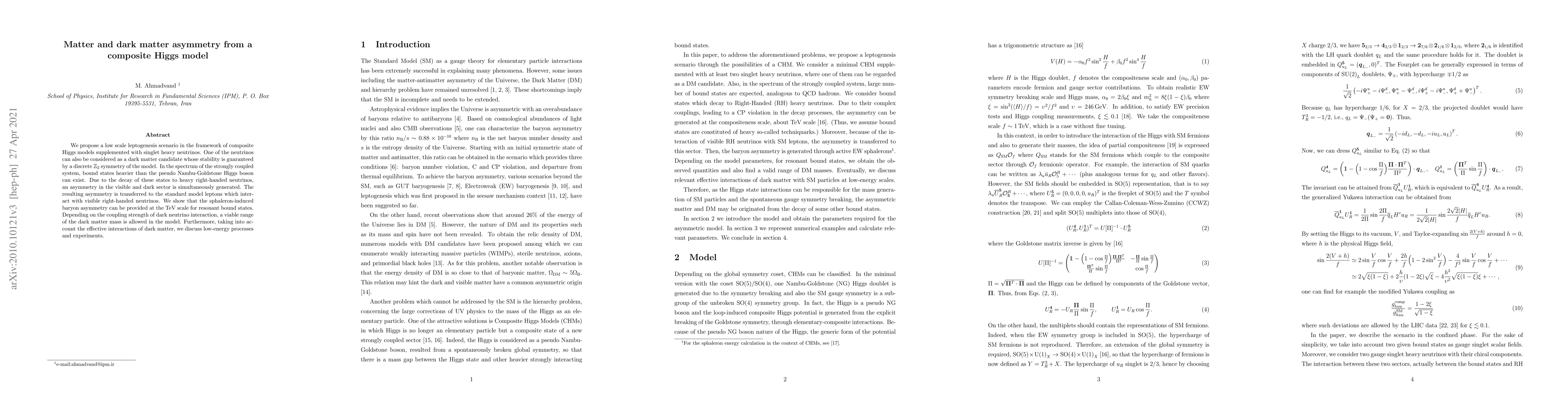 Researchers propose a composite Higgs model with singlet heavy neutrinos to generate matter-antimatter asymmetry, potentially explaining dark matter stability and providing a TeV-scale solution for baryon asymmetry.