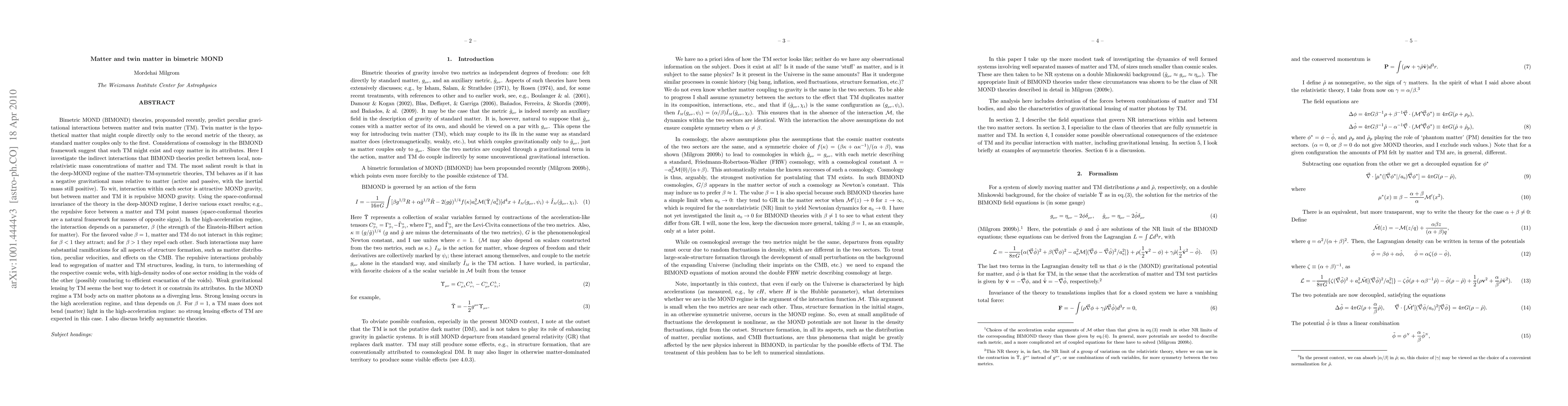 Bimetric MOND (BIMOND) theories, propounded recently, predict peculiar gravitational interactions between matter and twin matter (TM). Twin matter is hypothetical matter that might couple directly only to the second metric of the theory. Considerations of cosmology in the BIMOND framework suggest that such TM might exist and copy matter in its attributes. Here I investigate the indirect interactions that BIMOND theories predict between nonrelativistic masses of matter and TM. The most salient result is that in the deep-MOND regime of the matter-TM-symmetric theories, TM behaves as if it has a negative gravitational mass. To wit, interaction within each sector is attractive MOND gravity, but between matter and TM it is repulsive MOND gravity. In the high-acceleration regime, the interaction depends on a parameter, beta. For the favored value beta=1, matter and TM do not interact in this regime; for beta<1 they attract; and for beta>1 they repel each other. Such interactions may have substantial ramifications for all aspects of structure formation, such as matter distribution, peculiar velocities, and effects on the CMB. The repulsive interactions probably lead to segregation of matter and TM structures, leading, in turn, to intermeshing of the respective cosmic webs, with high-density nodes of one sector residing in the voids of the other (possibly conducing to efficient evacuation of the voids). Weak lensing by TM seems the best way to constrain its attributes. In the MOND regime a TM body acts on matter photons as a diverging lens. Strong lensing occurs in the high acceleration regime, and thus depends on the value of beta. For beta=1 no strong lensing effects of TM are expected. I also discuss briefly asymmetric theories (abridged).
