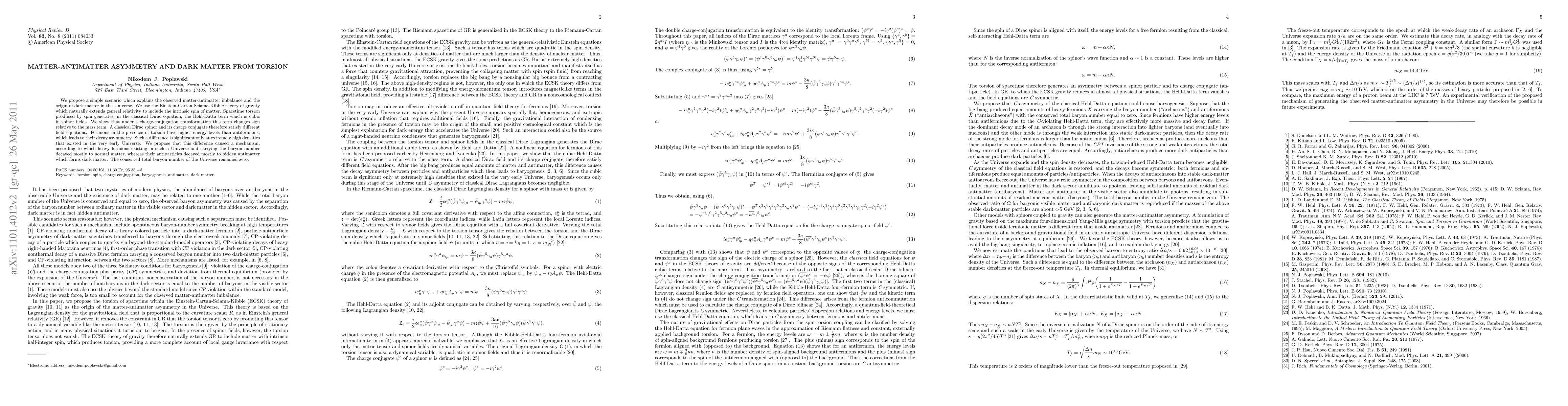 We propose a simple scenario which explains the observed matter-antimatter imbalance and the origin of dark matter in the Universe. We use the Einstein-Cartan-Sciama-Kibble theory of gravity which naturally extends general relativity to include the intrinsic spin of matter. Spacetime torsion produced by spin generates, in the classical Dirac equation, the Hehl-Datta term which is cubic in spinor fields. We show that under a charge-conjugation transformation this term changes sign relative to the mass term. A classical Dirac spinor and its charge conjugate therefore satisfy different field equations. Fermions in the presence of torsion have higher energy levels than antifermions, which leads to their decay asymmetry. Such a difference is significant only at extremely high densities that existed in the very early Universe. We propose that this difference caused a mechanism, according to which heavy fermions existing in such a Universe and carrying the baryon number decayed mostly to normal matter, whereas their antiparticles decayed mostly to hidden antimatter which forms dark matter. The conserved total baryon number of the Universe remained zero.