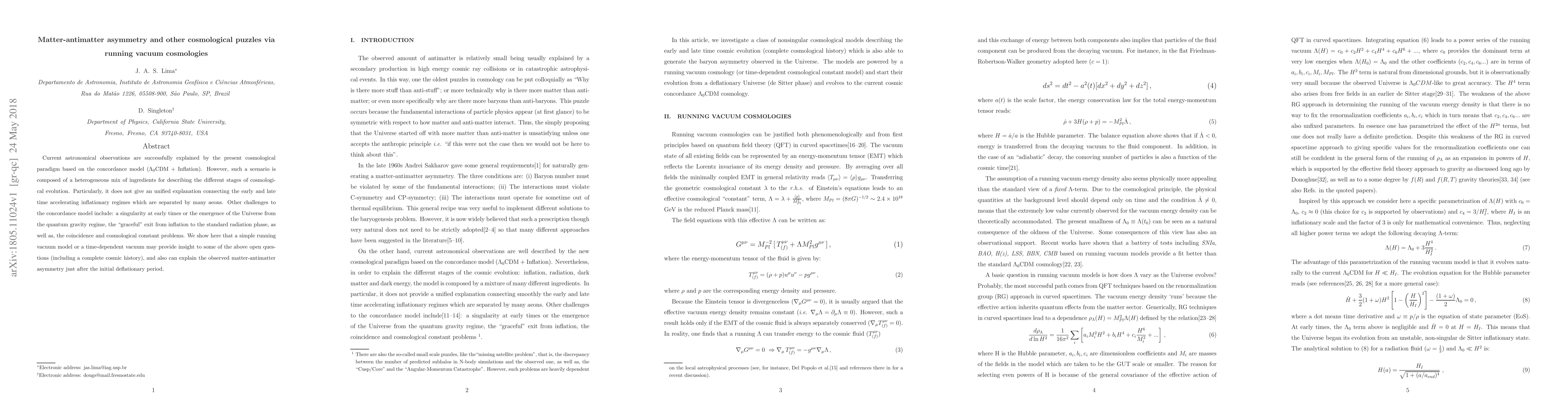 Current astronomical observations are successfully explained by the present cosmological paradigm based on the concordance model ($\Lambda_0$CDM + Inflation). However, such a scenario is composed of a heterogeneous mix of ingredients for describing the different stages of cosmological evolution. Particularly, it does not give an unified explanation connecting the early and late time accelerating inflationary regimes which are separated by many aeons. Other challenges to the concordance model include: a singularity at early times or the emergence of the Universe from the quantum gravity regime, the "graceful" exit from inflation to the standard radiation phase, as well as, the coincidence and cosmological constant problems. We show here that a simple running vacuum model or a time-dependent vacuum may provide insight to some of the above open questions (including a complete cosmic history), and also can explain the observed matter-antimatter asymmetry just after the initial deflationary period.