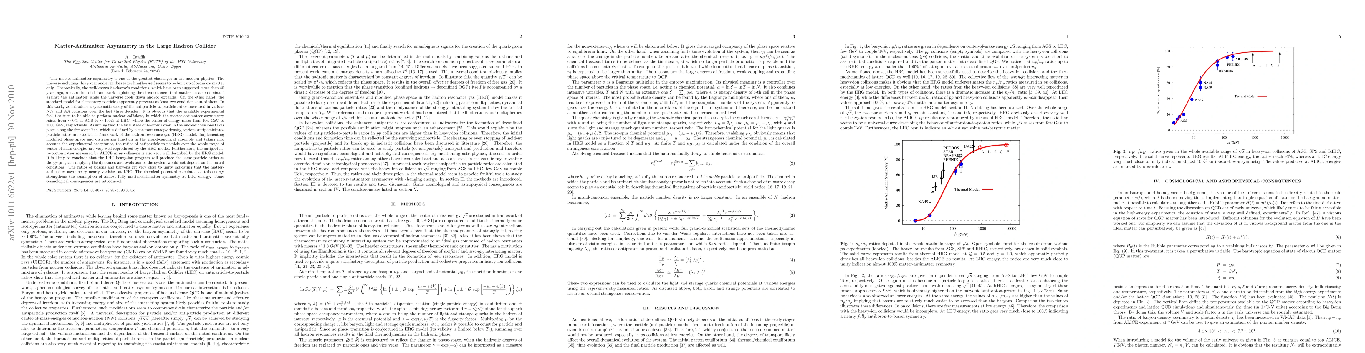 This paper investigates the matter-antimatter asymmetry observed in various nuclear collisions at the Large Hadron Collider (LHC), demonstrating that the hadron resonance gas (HRG) model effectively reproduces the measured antiparticle-to-particle ratios. The study suggests that the LHC's heavy-ion program mirrors the dynamics seen in proton-proton collisions, indicating a near-vanishing matter-antimatter asymmetry at high energies.