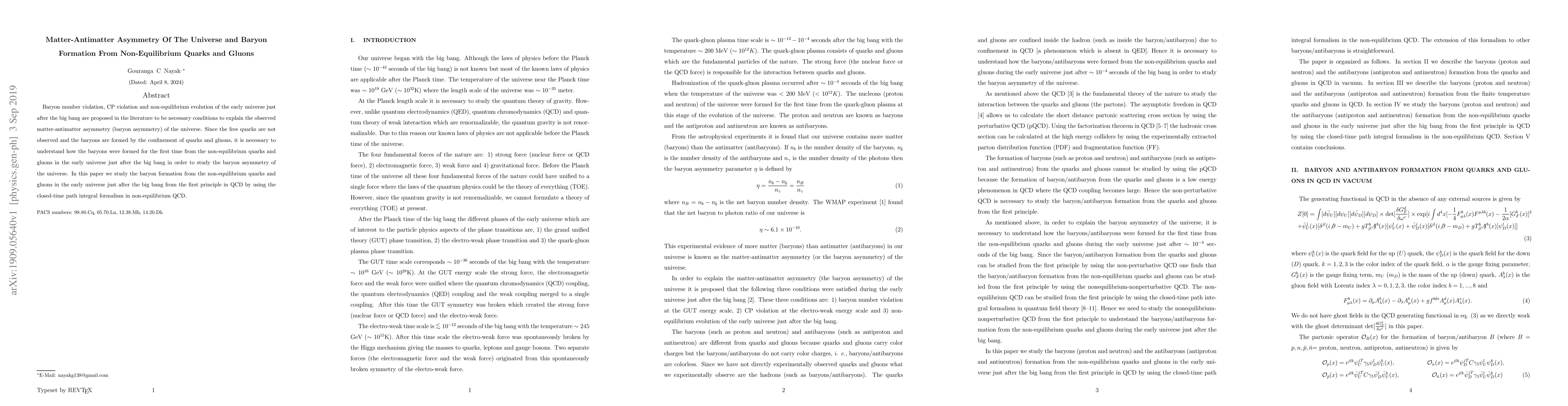 This paper investigates the formation of baryons from non-equilibrium quarks and gluons in the early universe, employing the closed-time path integral formalism in non-equilibrium QCD to understand the mechanisms behind the observed matter-antimatter asymmetry. The study aims to provide insights into the conditions necessary for baryon number violation and CP violation.