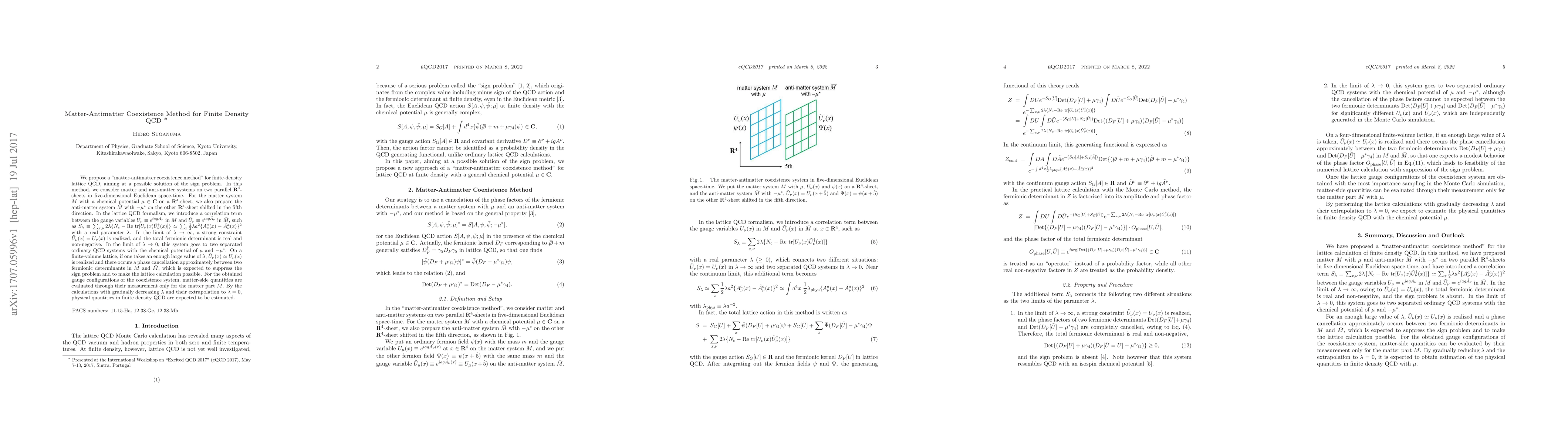 We propose a "matter-antimatter coexistence method" for finite-density lattice QCD, aiming at a possible solution of the sign problem. In this method, we consider matter and anti-matter systems on two parallel ${\bf R}^4$-sheets in five-dimensional Euclidean space-time. For the matter system $M$ with a chemical potential $\mu \in {\bf C}$ on a ${\bf R}^4$-sheet, we also prepare the anti-matter system $\bar M$ with $-\mu^*$ on the other ${\bf R}^4$-sheet shifted in the fifth direction. In the lattice QCD formalism, we introduce a correlation term between the gauge variables $U_\nu \equiv e^{iagA_\nu}$ in $M$ and $\tilde U_\nu \equiv e^{iag \tilde A_\nu}$ in $\bar M$, such as $S_\lambda \equiv \sum_{x,\nu} 2\lambda \{N_c-{\rm Re~tr} [U_\nu(x) \tilde U_\nu^\dagger(x)]\} \simeq \sum_x \frac{1}{2}\lambda a^2 \{A_\nu^a(x)-\tilde A_\nu^a(x)\}^2$ with a real parameter $\lambda$. In the limit of $\lambda \rightarrow \infty$, a strong constraint $\tilde U_\nu(x)=U_\nu(x)$ is realized, and the total fermionic determinant is real and non-negative. In the limit of $\lambda \rightarrow 0$, this system goes to two separated ordinary QCD systems with the chemical potential of $\mu$ and $-\mu^*$. On a finite-volume lattice, if one takes an enough large value of $\lambda$, $\tilde U_\nu(x) \simeq U_\nu(x)$ is realized and there occurs a phase cancellation approximately between two fermionic determinants in $M$ and $\bar M$, which is expected to suppress the sign problem and to make the lattice calculation possible. For the obtained gauge configurations of the coexistence system, matter-side quantities are evaluated through their measurement only for the matter part $M$. By the calculations with gradually decreasing $\lambda$ and their extrapolation to $\lambda=0$, physical quantities in finite density QCD are expected to be estimated.