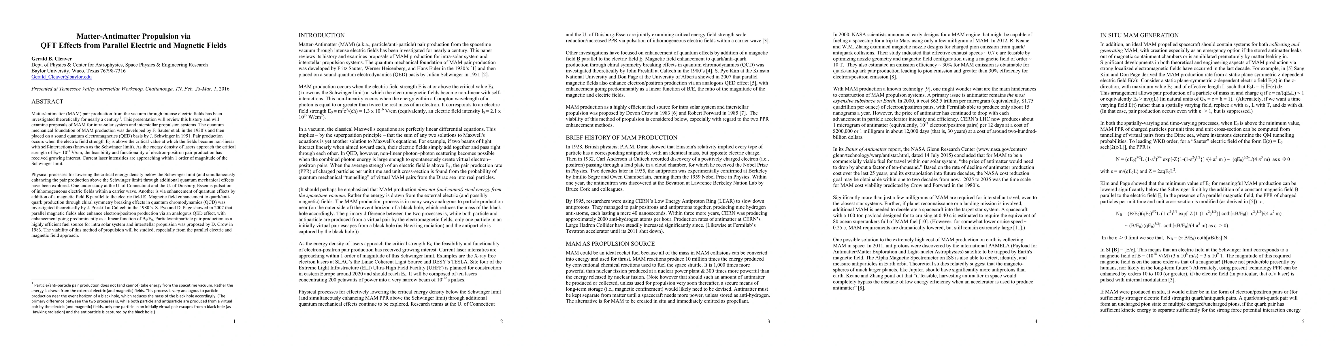 This paper reviews theoretical investigations into matter-antimatter pair production via quantum field theory effects from parallel electric and magnetic fields, focusing on the Schwinger limit and its implications for propulsion systems. It explores methods to lower the critical energy density for pair production and examines the potential of this process for efficient intra-solar system and interstellar propulsion.