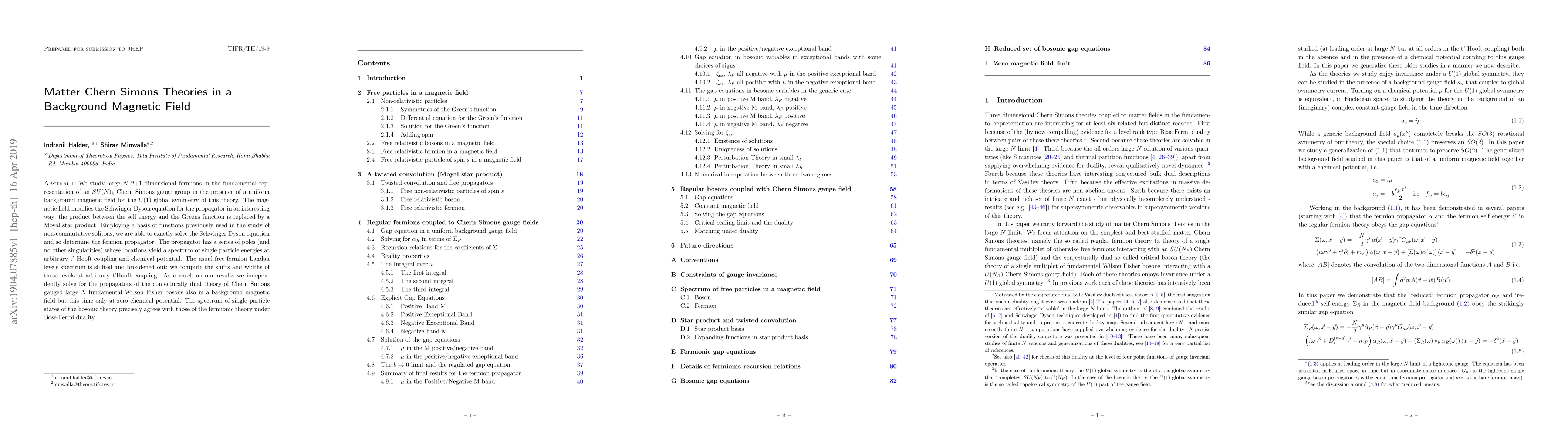 We study large $N$ 2+1 dimensional fermions in the fundamental representation of an $SU(N)_k$ Chern Simons gauge group in the presence of a uniform background magnetic field for the $U(1)$ global symmetry of this theory. The magnetic field modifies the Schwinger Dyson equation for the propagator in an interesting way; the product between the self energy and the Greens function is replaced by a Moyal star product. Employing a basis of functions previously used in the study of non-commutative solitons, we are able to exactly solve the Schwinger Dyson equation and so determine the fermion propagator. The propagator has a series of poles (and no other singularities) whose locations yield a spectrum of single particle energies at arbitrary t' Hooft coupling and chemical potential. The usual free fermion Landau levels spectrum is shifted and broadened out; we compute the shifts and widths of these levels at arbitrary t'Hooft coupling. As a check on our results we independently solve for the propagators of the conjecturally dual theory of Chern Simons gauged large $N$ fundamental Wilson Fisher bosons also in a background magnetic field but this time only at zero chemical potential. The spectrum of single particle states of the bosonic theory precisely agrees with those of the fermionic theory under Bose-Fermi duality.