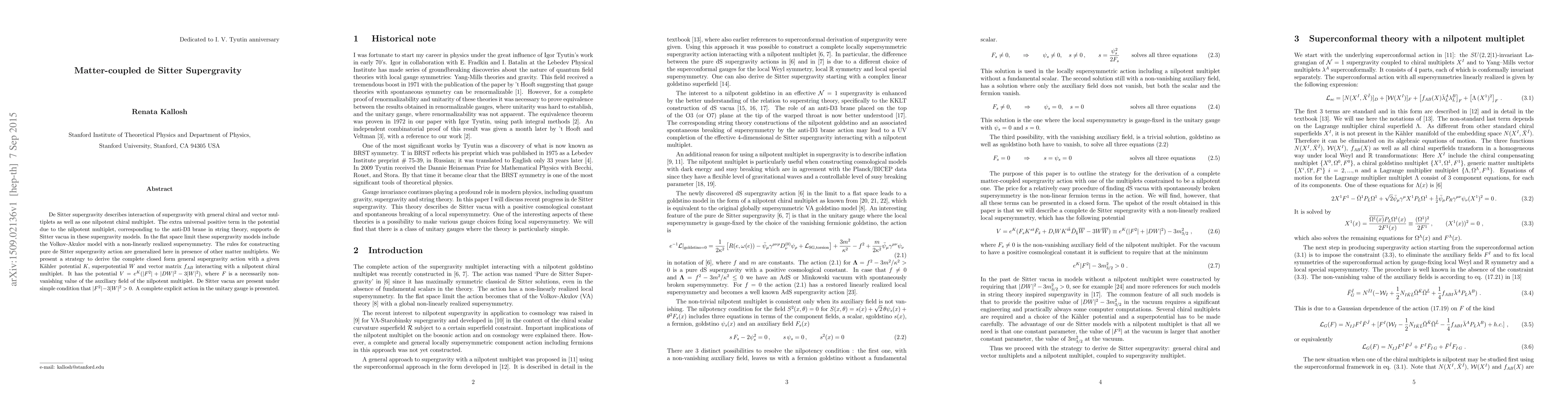 De Sitter supergravity describes interaction of supergravity with general chiral and vector multiplets as well as one nilpotent chiral multiplet. The extra universal positive term in the potential due to the nilpotent multiplet, corresponding to the anti-D3 brane in string theory, supports de Sitter vacua in these supergravity models. In the flat space limit these supergravity models include the Volkov-Akulov model with a non-linearly realized supersymmetry. The rules for constructing pure de Sitter supergravity action are generalized here in presence of other matter multiplets. We present a strategy to derive the complete closed form general supergravity action with a given Kahler potential $K$, superpotential $W$ and vector matrix $f_{AB}$ interacting with a nilpotent chiral multiplet. It has the potential $V=e^K(|F^2 |+ |DW|^2 - 3 |W|^2)$, where $F$ is a necessarily non-vanishing value of the auxiliary field of the nilpotent multiplet. De Sitter vacua are present under simple condition that $|F^2|- 3|W|^2>0$. A complete explicit action in the unitary gauge is presented.