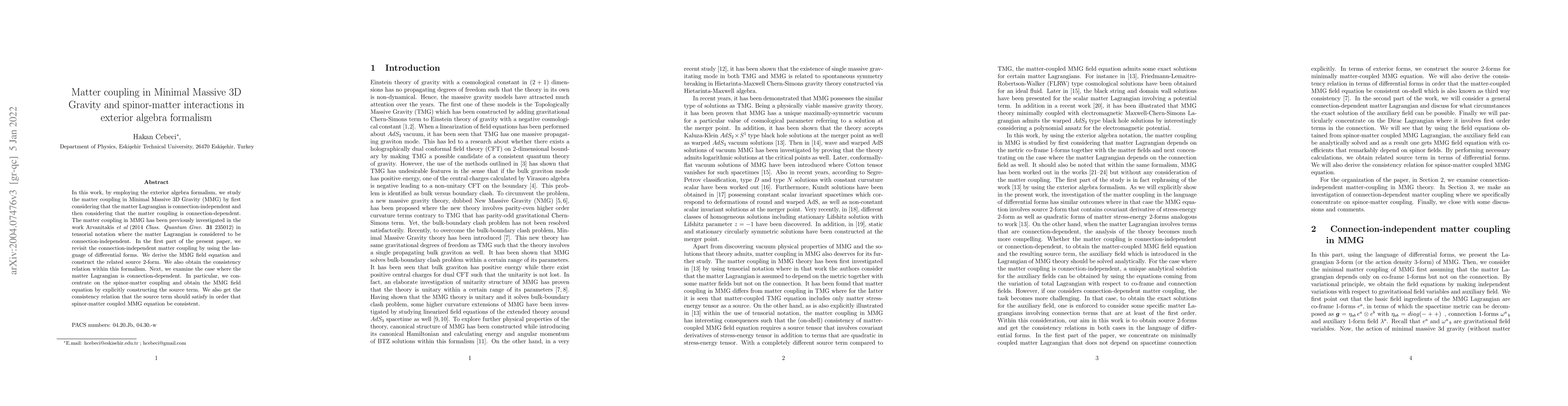 In this work, by employing the exterior algebra formalism, we study the matter coupling in Minimal Massive 3D Gravity (MMG) by first considering that the matter Lagrangian is connection-independent and then considering that the matter coupling is connection-dependent. The matter coupling in MMG has been previously investigated in the work Arvanitakis {\it et al} (2014 {\it Class. Quantum Grav.} {\bf 31} 235012) in tensorial notation where the matter Lagrangian is considered to be connection-independent. In the first part of the present paper, we revisit the connection-independent matter coupling by using the language of differential forms. We derive the MMG field equation and construct the related source 2-form. We also obtain the consistency relation within this formalism. Next, we examine the case where the matter Lagrangian is connection-dependent. In particular, we concentrate on the spinor-matter coupling and obtain the MMG field equation by explicitly constructing the source term. We also get the consistency relation that the source term should satisfy in order that spinor-matter coupled MMG equation be consistent.