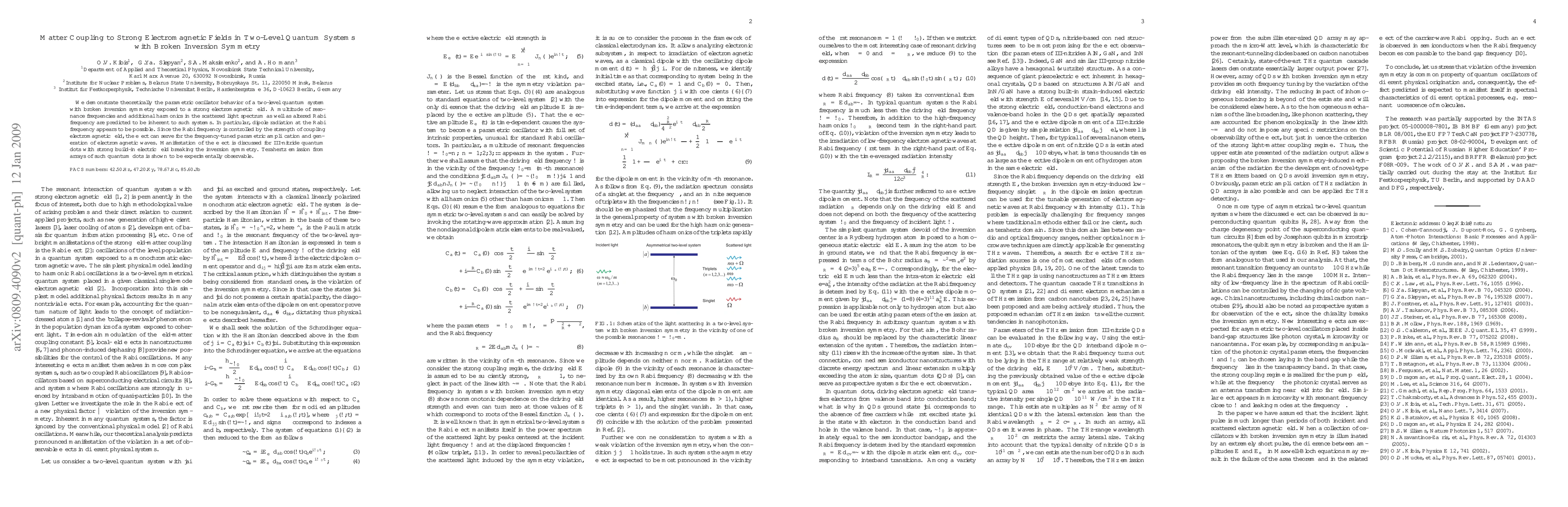 This paper theoretically explores the behavior of two-level quantum systems with broken inversion symmetry under strong electromagnetic fields, predicting resonance frequencies and harmonics in scattered light, and the potential for dipole radiation at the Rabi frequency. The study suggests practical applications in frequency-tuned parametric amplification and terahertz emission from III-nitride quantum dots.