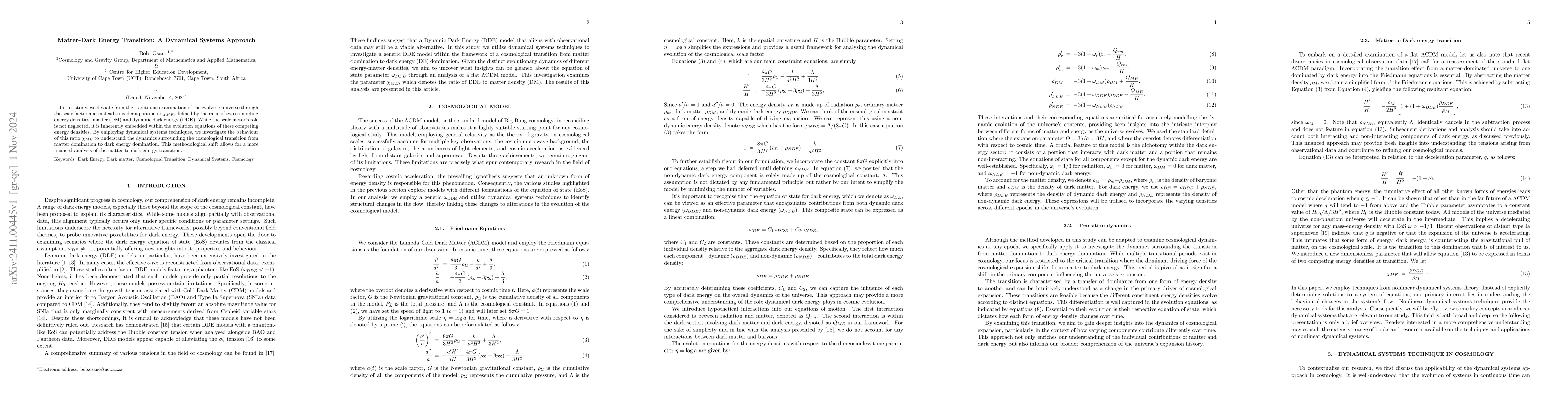 In this study, we deviate from the traditional examination of the evolving universe through the scale factor and instead consider a parameter \(\chi_{ME}\), defined by the ratio of two competing energy densities: matter (DM) and dynamic dark energy (DDE). While the scale factor's role is not neglected, it is inherently embedded within the evolution equations of these competing energy densities. By employing dynamical systems techniques, we investigate the behaviour of this ratio \(\chi_{ME}\) to understand the dynamics surrounding the cosmological transition from matter domination to dark energy domination. This methodological shift allows for a more nuanced analysis of the matter-to-dark energy transition.